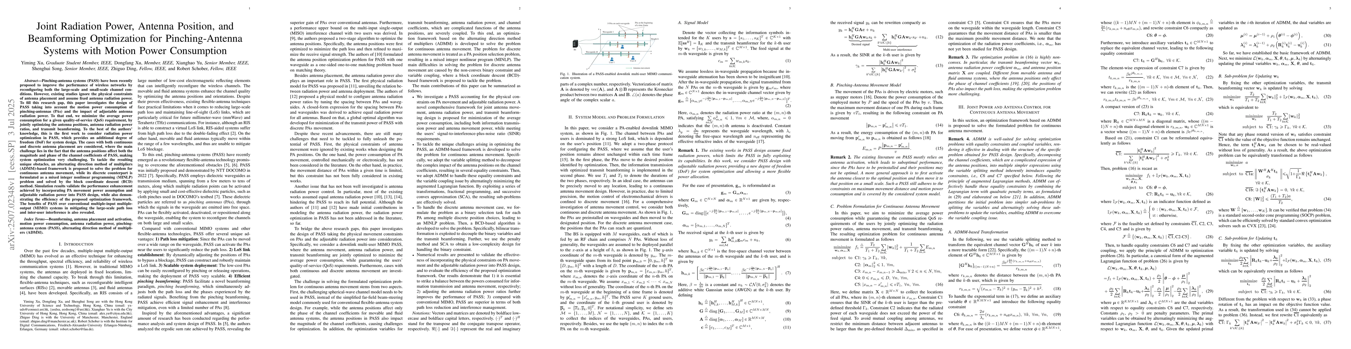 Pinching-antenna systems (PASS) have been recently proposed to improve the performance of wireless networks by reconfiguring both the large-scale and small-scale channel conditions. However, existing studies ignore the physical constraints of antenna placement and assume fixed antenna radiation power. To fill this research gap, this paper investigates the design of PASS taking into account the motion power consumption of pinching-antennas (PAs) and the impact of adjustable antenna radiation power. To that end, we minimize the average power consumption for a given quality-of-service (QoS) requirement, by jointly optimizing the antenna positions, antenna radiation power ratios, and transmit beamforming. To the best of the authors' knowledge, this is the first work to consider radiation power optimization in PASS, which provides an additional degree of freedom (DoF) for system design. The cases with both continuous and discrete antenna placement are considered, where the main challenge lies in the fact that the antenna positions affect both the magnitude and phase of the channel coefficients of PASS, making system optimization very challenging. To tackle the resulting unique obstacles, an alternating direction method of multipliers (ADMM)-based framework is proposed to solve the problem for continuous antenna movement, while its discrete counterpart is formulated as a mixed integer nonlinear programming (MINLP) problem and solved by the block coordinate descent (BCD) method. Simulation results validate the performance enhancement achieved by incorporating PA movement power assumption and adjustable radiation power into PASS design, while also demonstrating the efficiency of the proposed optimization framework. The benefits of PASS over conventional multiple-input multiple-output (MIMO) systems in mitigating the large-scale path loss and inter-user interference is also revealed.