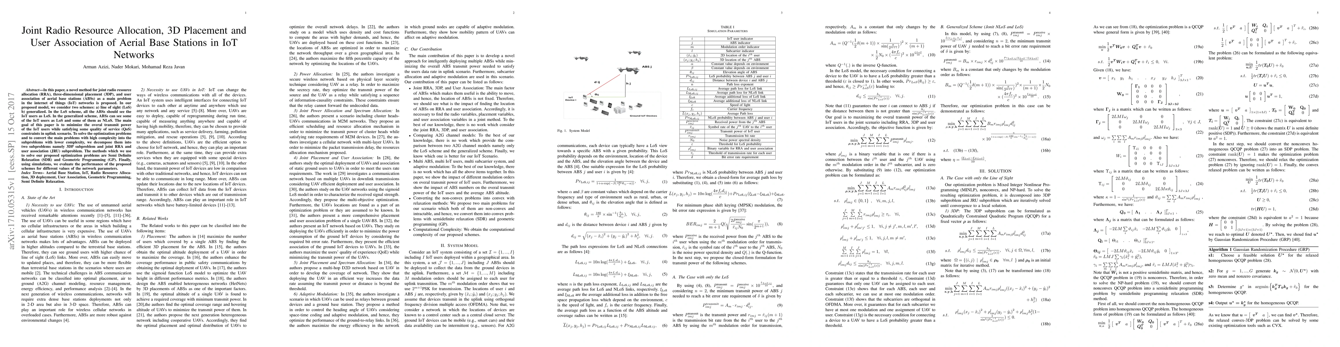 This paper proposes a novel method for jointly optimizing radio resource allocation, three-dimensional placement, and user association of aerial base stations in IoT networks, aiming to minimize transmit power while meeting QoS constraints. The method employs Semi Definite Relaxation and Geometric Programming to solve complex optimization problems, and simulations evaluate its performance under varying network parameters.