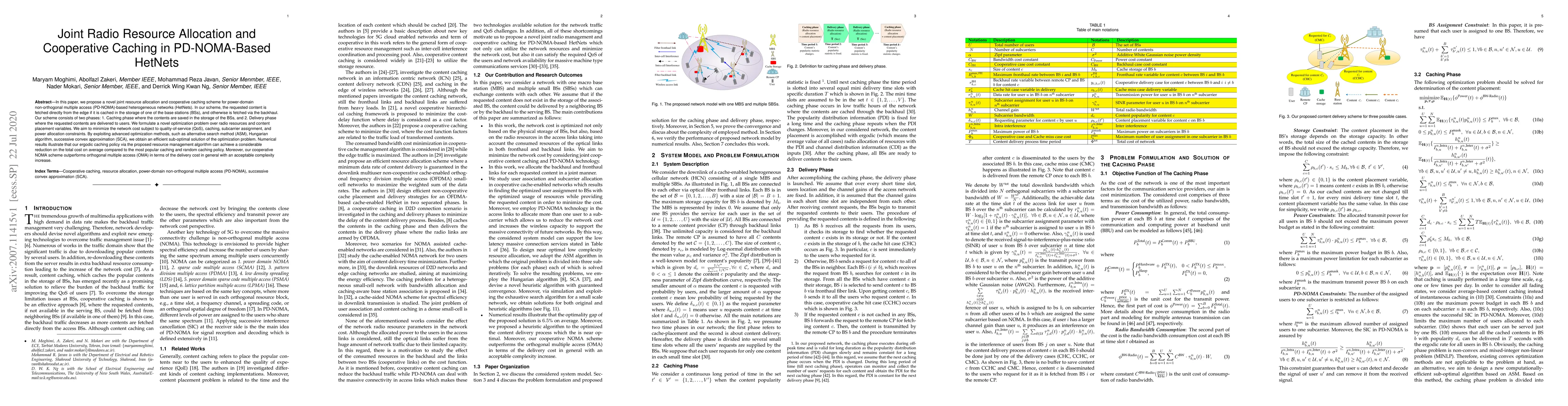 This paper proposes a joint resource allocation and cooperative caching scheme for PD-NOMA-based HetNets, aiming to minimize network cost while meeting QoS constraints. The scheme uses advanced optimization methods to achieve a sub-optimal solution, demonstrating significant cost reduction compared to popular caching policies and improved performance over OMA.