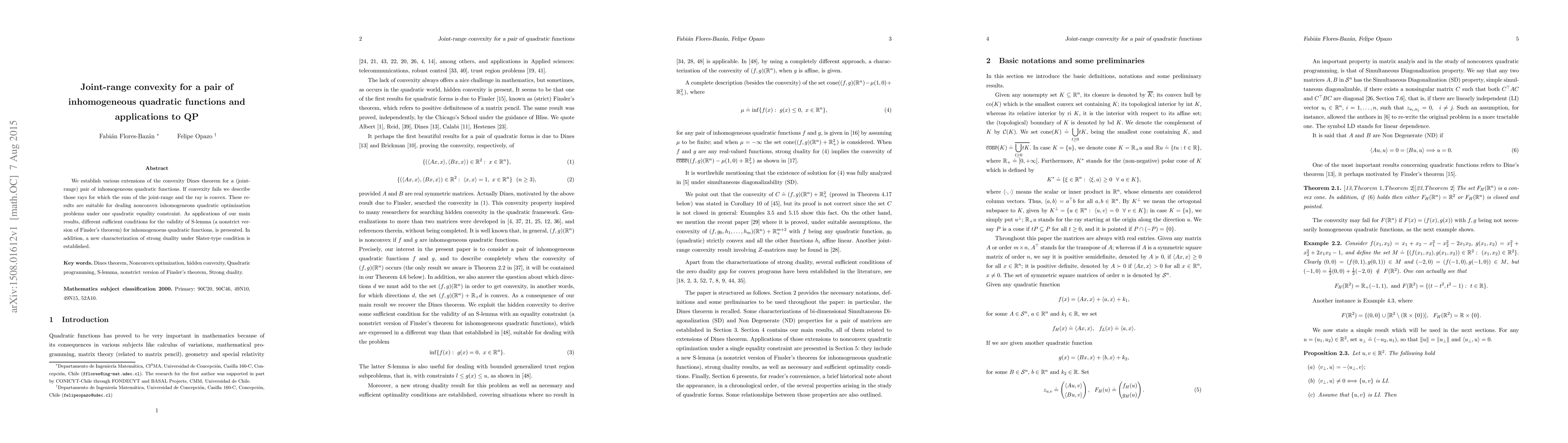 This paper extends the convexity Dines theorem for pairs of inhomogeneous quadratic functions, identifying rays where their sum remains convex even when joint-range convexity fails. It provides applications in nonconvex quadratic optimization and presents sufficient conditions for the S-lemma and a new characterization of strong duality under Slater-type conditions.