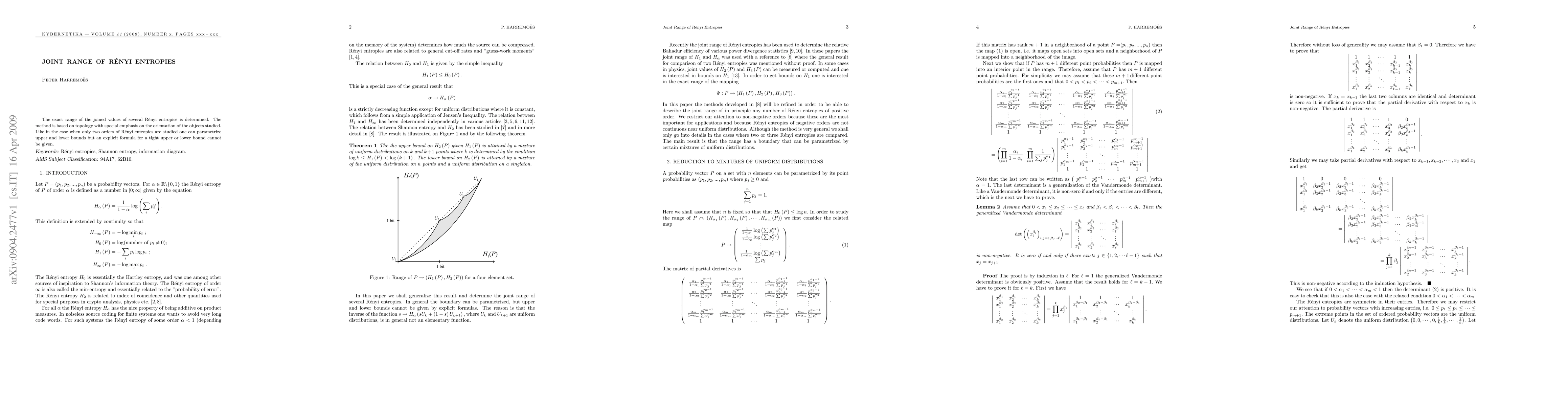 The research determines the exact range of joined values of several Rényi entropies using topology, focusing on the orientation of the objects studied. It shows that while upper and lower bounds can be parametrized, explicit formulas for tight bounds cannot be given.