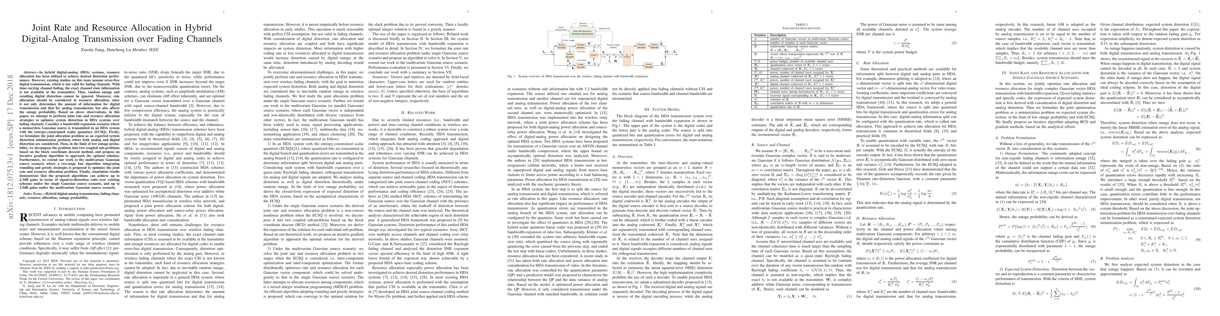 This paper proposes joint rate and resource allocation strategies to optimize system distortion in hybrid digital-analog (HDA) systems over fading channels, addressing the limitations of existing error-free digital transmission assumptions. The authors develop an iterative gradient algorithm for single Gaussian sources and a two-stage fast algorithm for multivariate sources, achieving up to 3.5dB gains in signal-to-distortion ratio compared to existing methods.