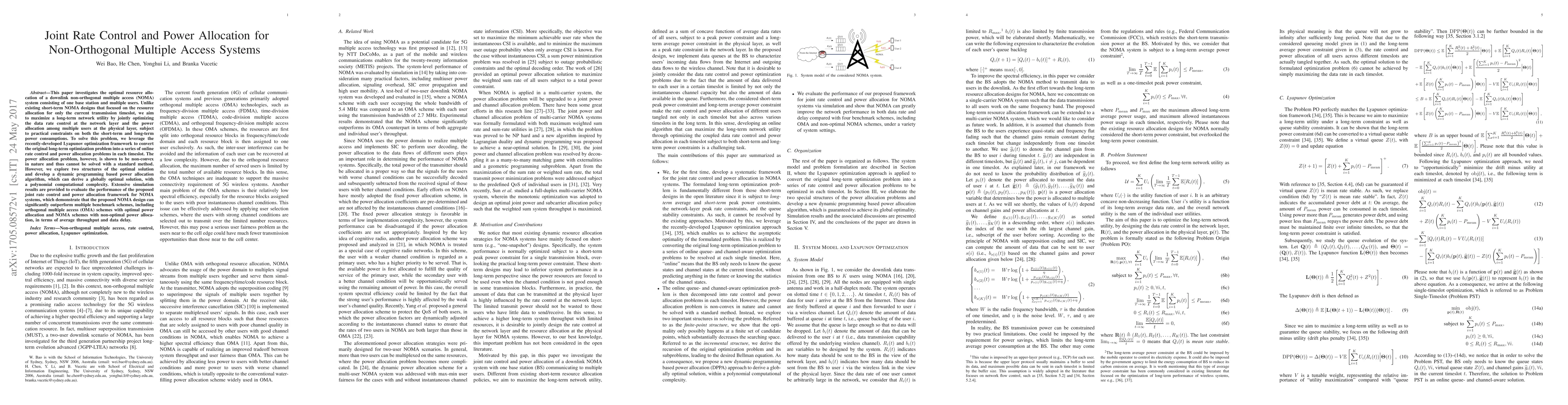 This paper investigates the optimal resource allocation of a downlink non-orthogonal multiple access (NOMA) system consisting of one base station and multiple users. Unlike existing short-term NOMA designs that focused on the resource allocation for only the current transmission timeslot, we aim to maximize a long-term network utility by jointly optimizing the data rate control at the network layer and the power allocation among multiple users at the physical layer, subject to practical constraints on both the short-term and long-term power consumptions. To solve this problem, we leverage the recently-developed Lyapunov optimization framework to convert the original long-term optimization problem into a series of online rate control and power allocation problems in each timeslot. The power allocation problem, however, is shown to be non-convex in nature and thus cannot be solved with a standard method. However, we explore two structures of the optimal solution and develop a dynamic programming based power allocation algorithm, which can derive a globally optimal solution, with a polynomial computational complexity. Extensive simulation results are provided to evaluate the performance of the proposed joint rate control and power allocation framework for NOMA systems, which demonstrate that the proposed NOMA design can significantly outperform multiple benchmark schemes, including orthogonal multiple access (OMA) schemes with optimal power allocation and NOMA schemes with non-optimal power allocation, in terms of average throughput and data delay.