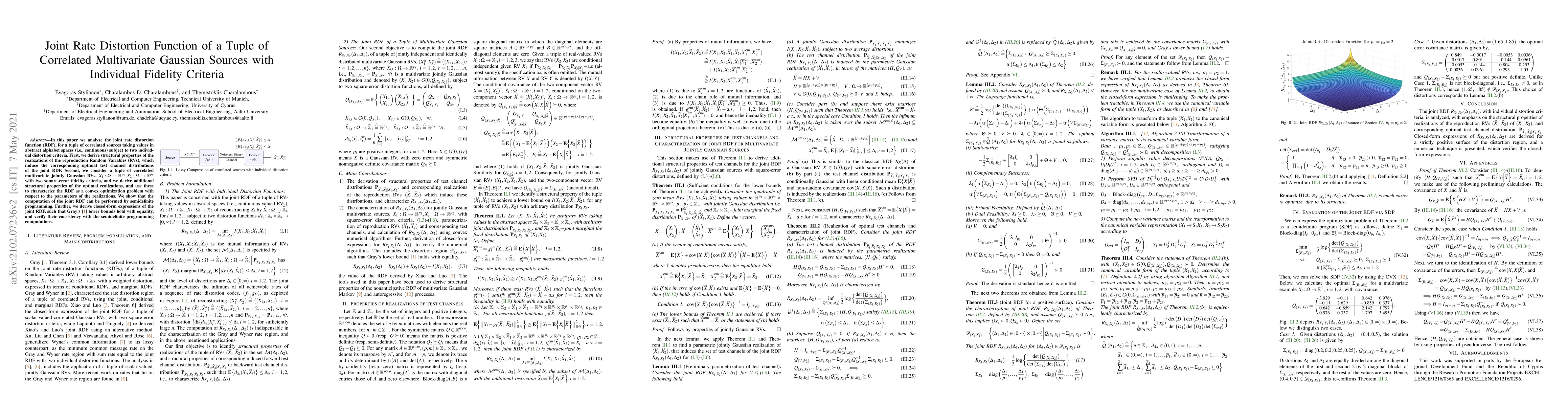 In this paper we analyze the joint rate distortion function (RDF), for a tuple of correlated sources taking values in abstract alphabet spaces (i.e., continuous) subject to two individual distortion criteria. First, we derive structural properties of the realizations of the reproduction Random Variables (RVs), which induce the corresponding optimal test channel distributions of the joint RDF. Second, we consider a tuple of correlated multivariate jointly Gaussian RVs, $X_1 : \Omega \rightarrow {\mathbb R}^{p_1}, X_2 : \Omega \rightarrow {\mathbb R}^{p_2}$ with two square-error fidelity criteria, and we derive additional structural properties of the optimal realizations, and use these to characterize the RDF as a convex optimization problem with respect to the parameters of the realizations. We show that the computation of the joint RDF can be performed by semidefinite programming. Further, we derive closed-form expressions of the joint RDF, such that Gray's [1] lower bounds hold with equality, and verify their consistency with the semidefinite programming computations.