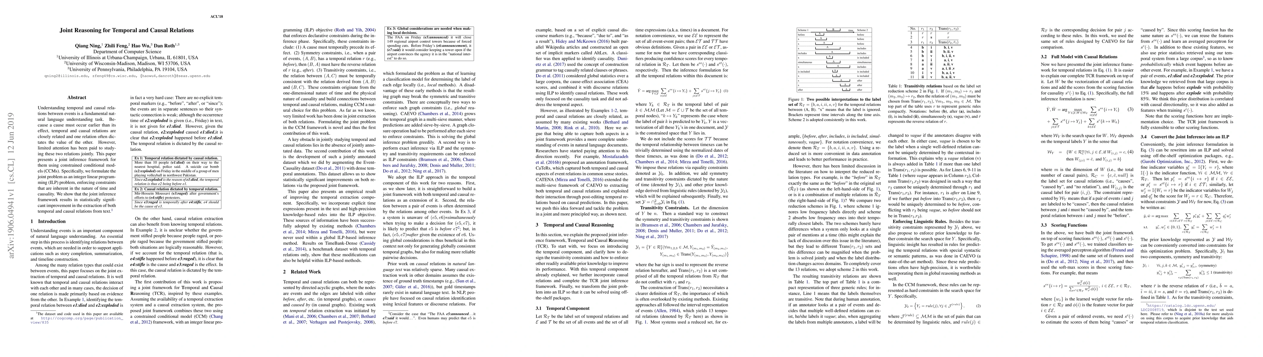 This paper introduces a joint inference framework using constrained conditional models to simultaneously extract temporal and causal relations from text, demonstrating significant improvements over separate methods through an integer linear programming approach.