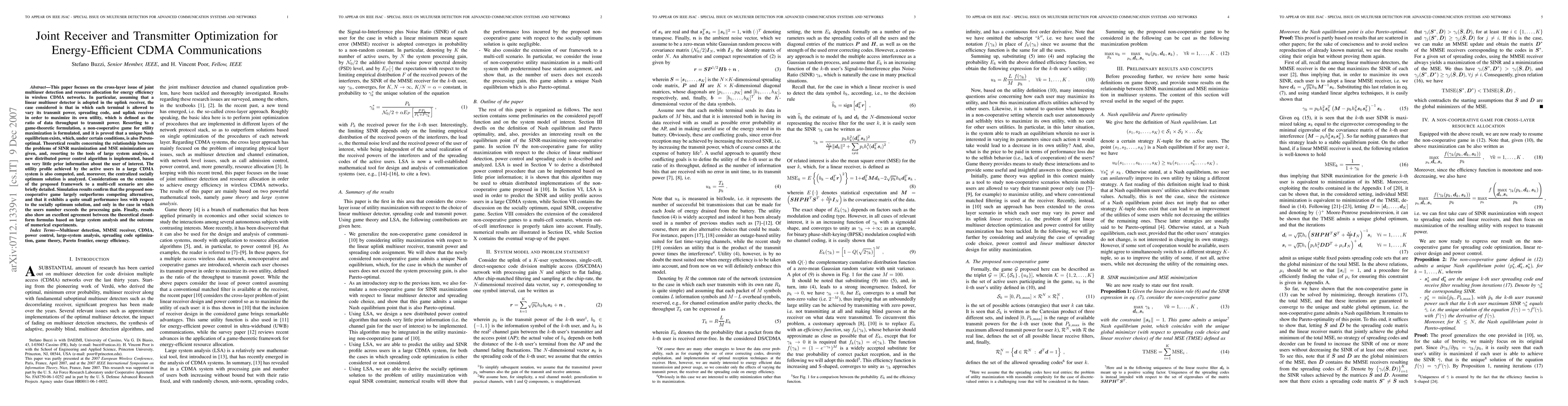 This paper proposes a joint receiver and transmitter optimization framework for energy-efficient CDMA communications, utilizing a non-cooperative game for utility maximization. Simulation results show that the proposed approach outperforms alternatives and closely approximates the socially optimum solution, with theoretical results validated by numerical experiments.