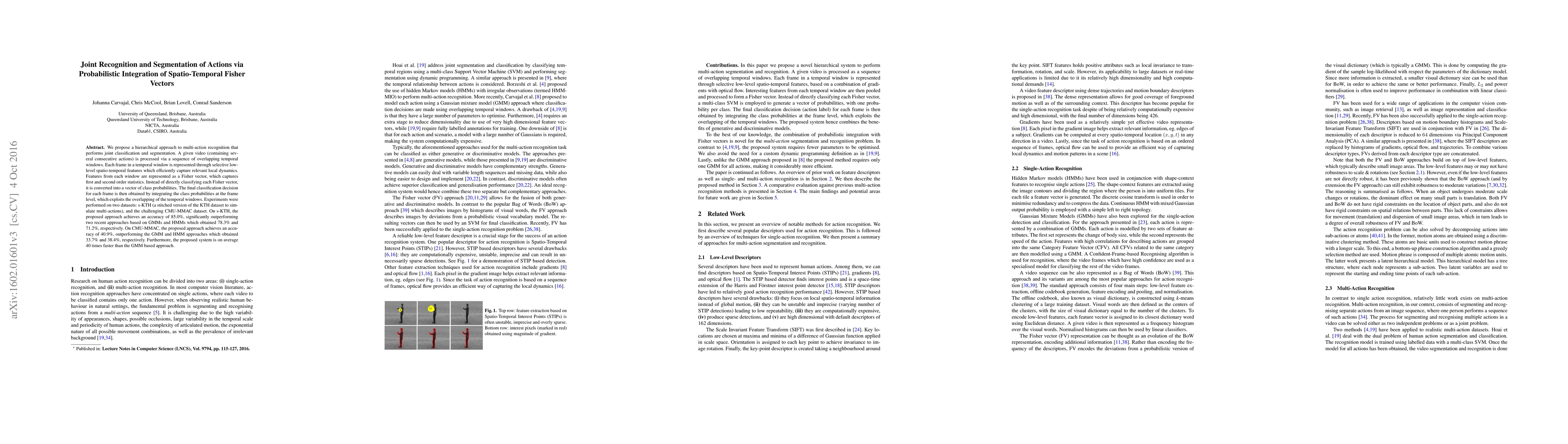 We propose a hierarchical approach to multi-action recognition that performs joint classification and segmentation. A given video (containing several consecutive actions) is processed via a sequence of overlapping temporal windows. Each frame in a temporal window is represented through selective low-level spatio-temporal features which efficiently capture relevant local dynamics. Features from each window are represented as a Fisher vector, which captures first and second order statistics. Instead of directly classifying each Fisher vector, it is converted into a vector of class probabilities. The final classification decision for each frame is then obtained by integrating the class probabilities at the frame level, which exploits the overlapping of the temporal windows. Experiments were performed on two datasets: s-KTH (a stitched version of the KTH dataset to simulate multi-actions), and the challenging CMU-MMAC dataset. On s-KTH, the proposed approach achieves an accuracy of 85.0%, significantly outperforming two recent approaches based on GMMs and HMMs which obtained 78.3% and 71.2%, respectively. On CMU-MMAC, the proposed approach achieves an accuracy of 40.9%, outperforming the GMM and HMM approaches which obtained 33.7% and 38.4%, respectively. Furthermore, the proposed system is on average 40 times faster than the GMM based approach.