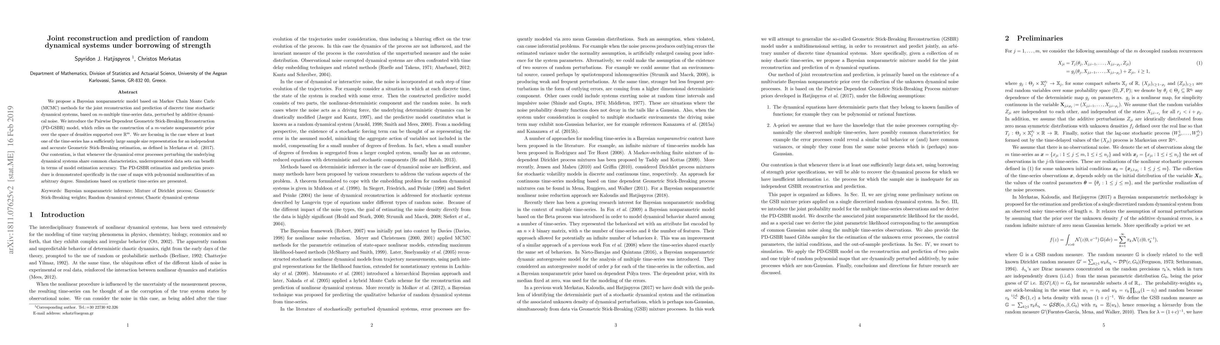 This paper proposes a Bayesian nonparametric model using MCMC for reconstructing and predicting stochastic dynamical systems from multiple time-series data, leveraging the borrowing of strength from a larger dataset to improve estimation accuracy for underrepresented datasets. The Pairwise Dependent Geometric Stick-Breaking Reconstruction (PD-GSBR) model is demonstrated on polynomial nonlinear maps.
