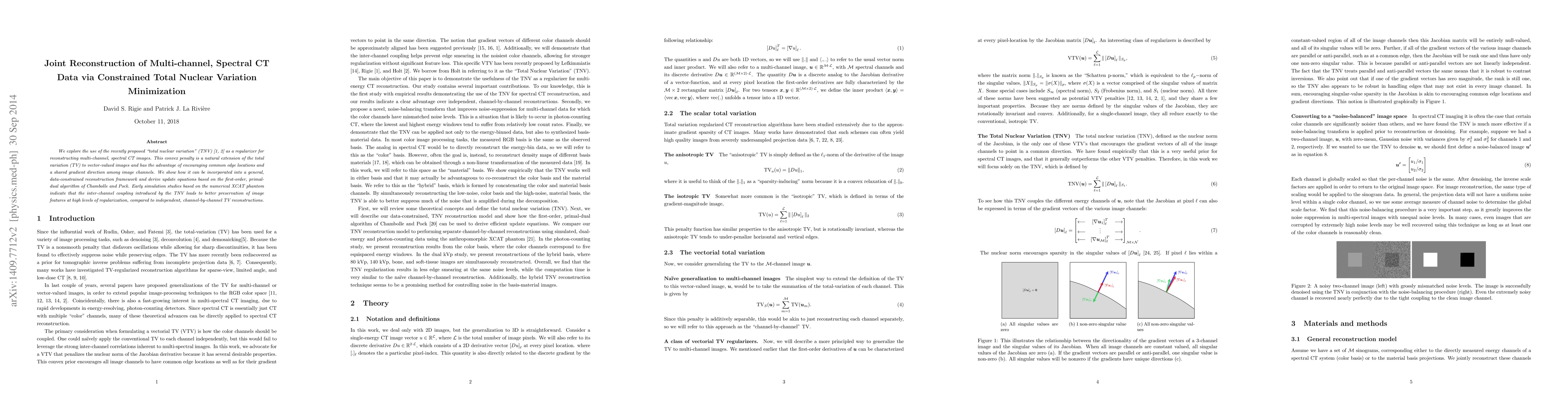This paper proposes using total nuclear variation (TNV) as a regularizer for reconstructing multi-channel spectral CT images, encouraging shared gradients and edge locations across channels. Simulation results show TNV improves feature preservation compared to separate total variation reconstructions.