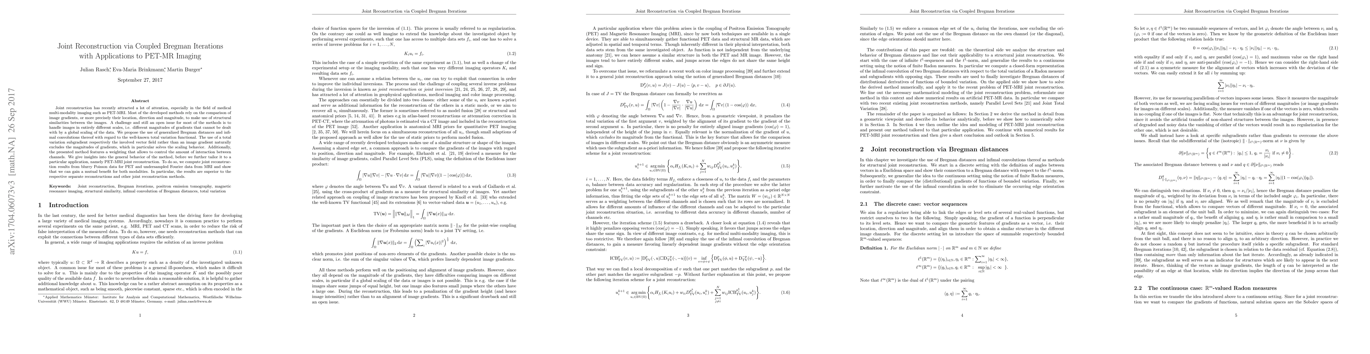 This paper proposes a joint reconstruction method using coupled Bregman iterations to address the challenge of scaling differences in PET-MRI imaging. The method leverages generalized Bregman distances and total variation functionals to handle varying gradient magnitudes, offering improved interaction control between modalities. The results demonstrate superior performance in joint reconstruction compared to separate and other joint methods.
