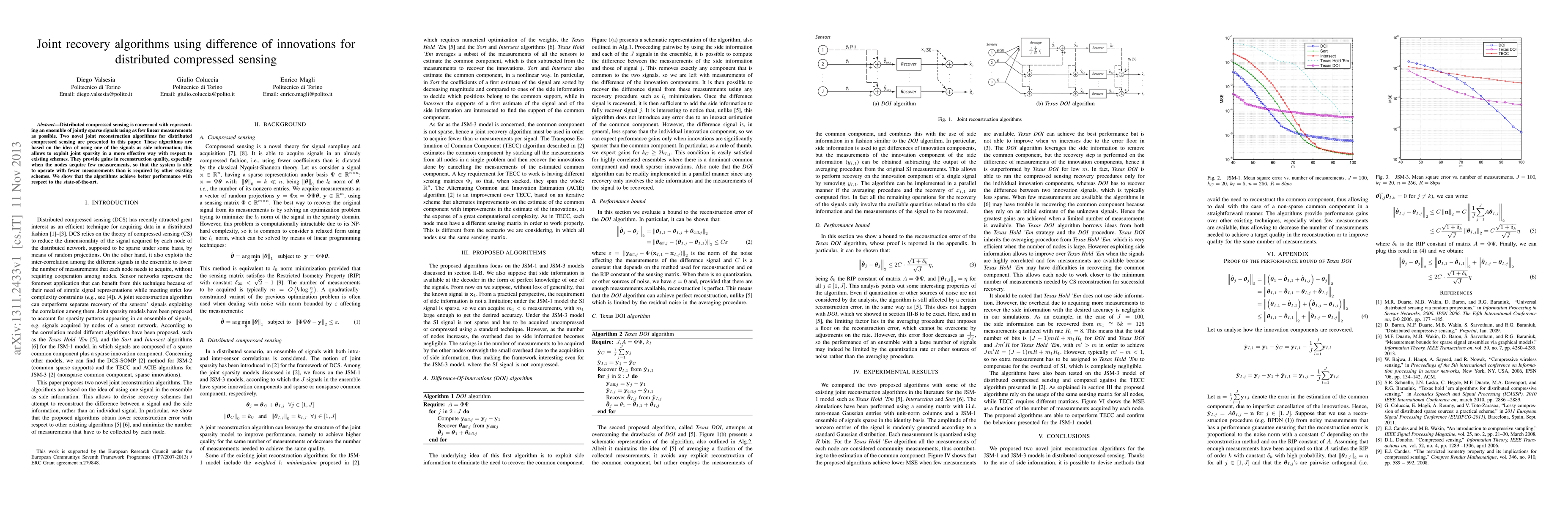 Two novel algorithms for distributed compressed sensing improve reconstruction quality by exploiting joint sparsity with minimal measurements, achieving better performance than existing schemes.