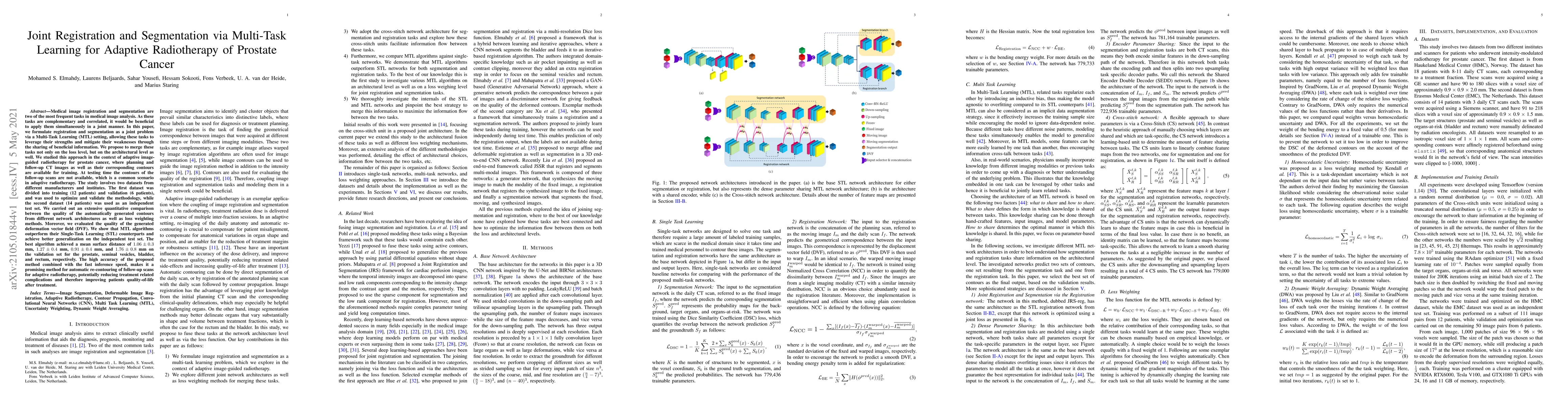 This paper proposes a Multi-Task Learning (MTL) approach for joint medical image registration and segmentation in adaptive radiotherapy for prostate cancer, achieving better accuracy and generalization compared to Single-Task Learning. The method shows promising results in automatically generating precise contours for prostate and surrounding organs.