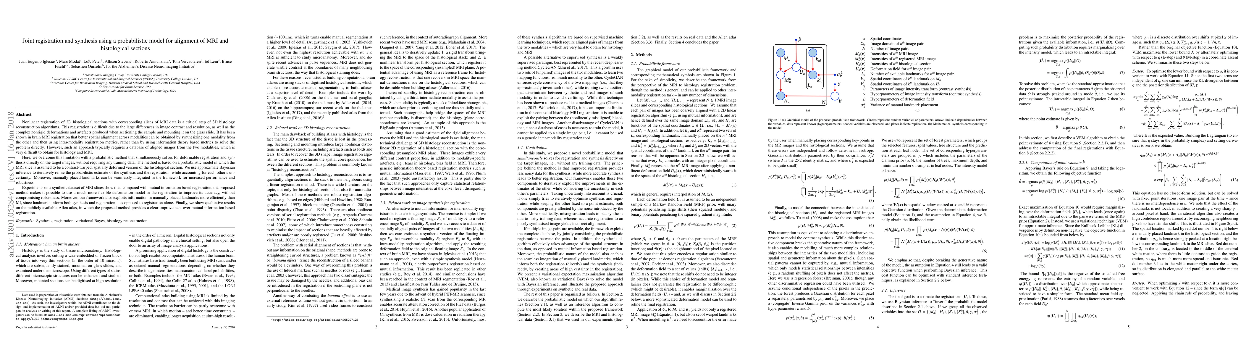 This paper proposes a probabilistic model for aligning MRI and histological sections by jointly solving registration and synthesis without requiring a training dataset. The method uses Bayesian inference to iteratively refine synthesis and registration, leveraging manually placed landmarks for enhanced performance, and demonstrates improved accuracy over mutual information-based registration.