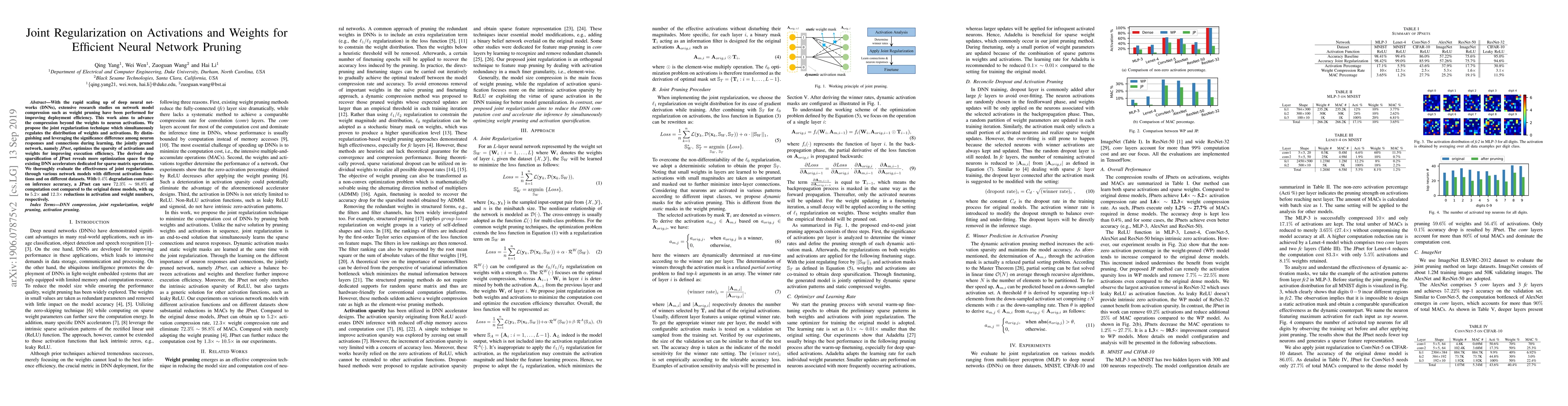 This paper proposes a joint regularization technique for neural network pruning that optimizes both weight and activation sparsity, leading to significant computational efficiency improvements. The method, named JPnet, achieves up to 98.8% reduction in computation cost with minimal accuracy loss, demonstrating substantial optimization for sparse matrix operations.