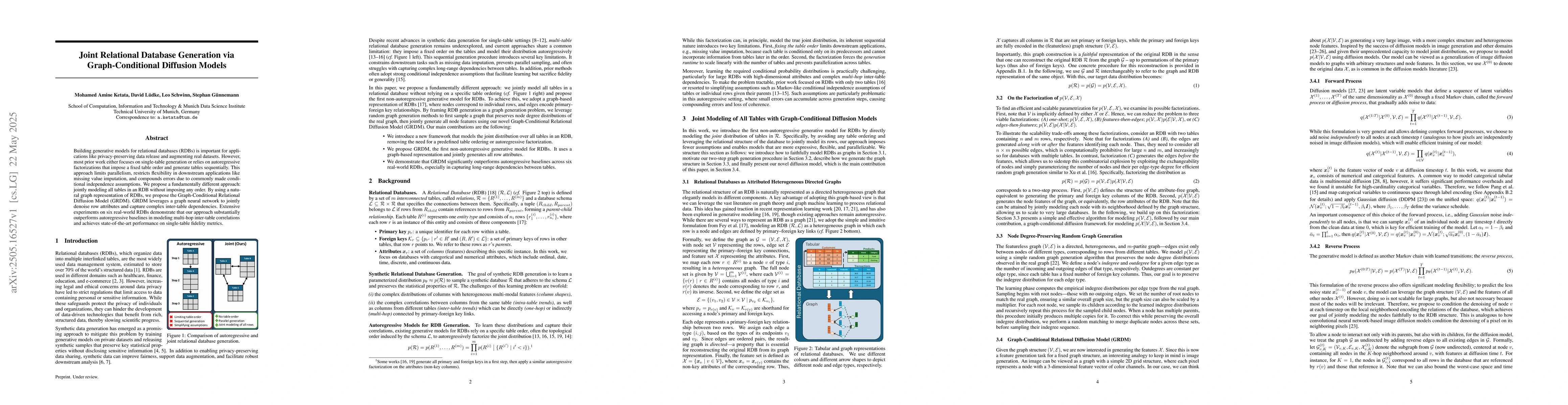The primary technical contribution is the Graph-Conditional Relational Diffusion Model (GRDM), which jointly models all tables in an RDB using graph neural networks to capture complex inter-table dependencies.