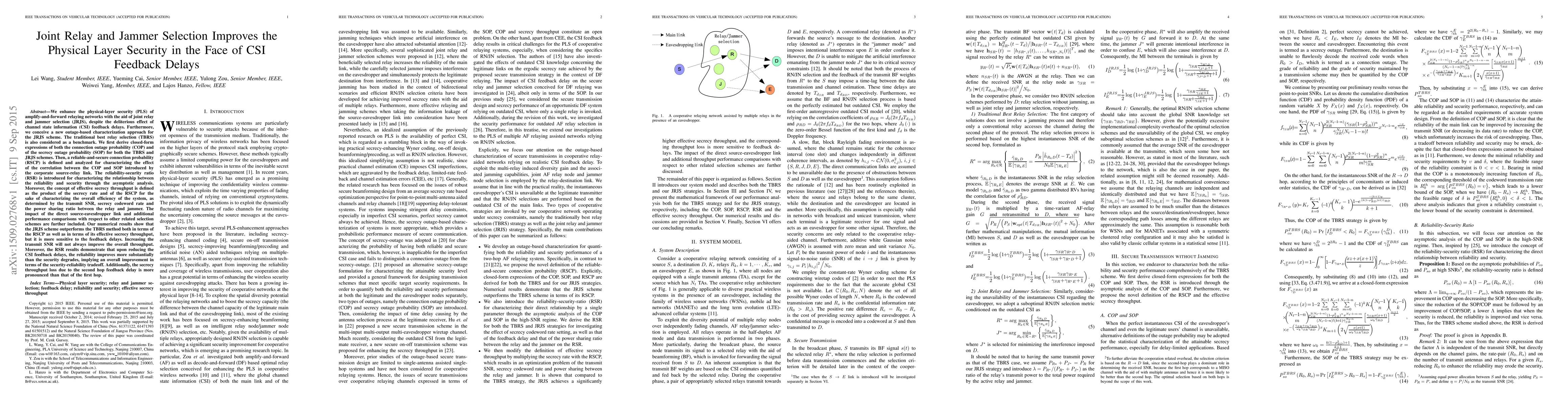This paper proposes joint relay and jammer selection (JRJS) to enhance physical-layer security in amplify-and-forward relay networks, despite channel state information (CSI) feedback delays. It introduces new outage-based characterization and outperforms traditional best relay selection (TBRS) in terms of reliable-and-secure connection probability and effective secrecy throughput.