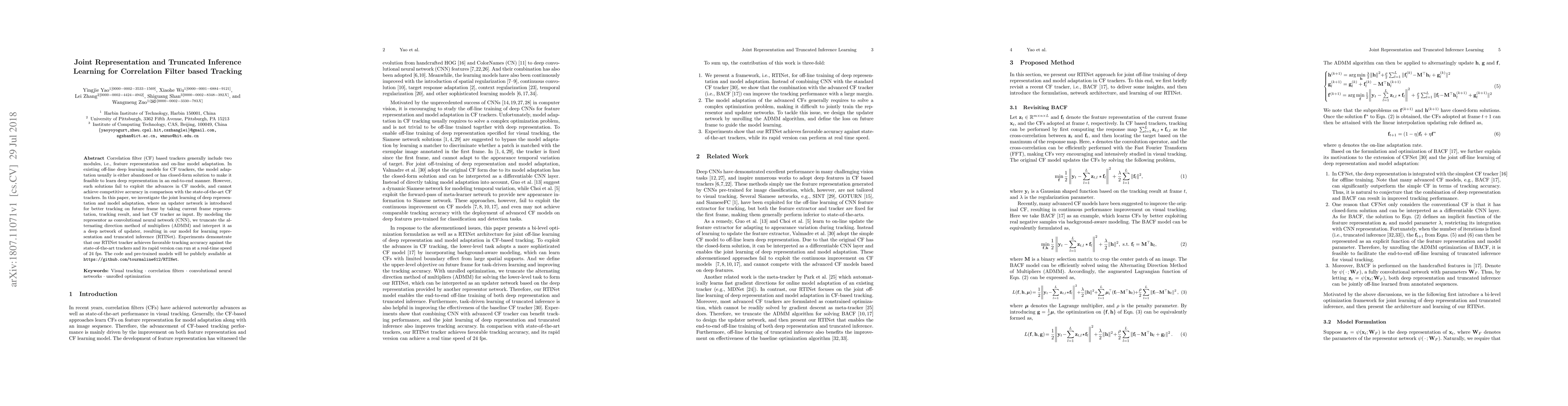 Correlation filter (CF) based trackers generally include two modules, i.e., feature representation and on-line model adaptation. In existing off-line deep learning models for CF trackers, the model adaptation usually is either abandoned or has closed-form solution to make it feasible to learn deep representation in an end-to-end manner. However, such solutions fail to exploit the advances in CF models, and cannot achieve competitive accuracy in comparison with the state-of-the-art CF trackers. In this paper, we investigate the joint learning of deep representation and model adaptation, where an updater network is introduced for better tracking on future frame by taking current frame representation, tracking result, and last CF tracker as input. By modeling the representor as convolutional neural network (CNN), we truncate the alternating direction method of multipliers (ADMM) and interpret it as a deep network of updater, resulting in our model for learning representation and truncated inference (RTINet). Experiments demonstrate that our RTINet tracker achieves favorable tracking accuracy against the state-of-the-art trackers and its rapid version can run at a real-time speed of 24 fps. The code and pre-trained models will be publicly available at https://github.com/tourmaline612/RTINet.