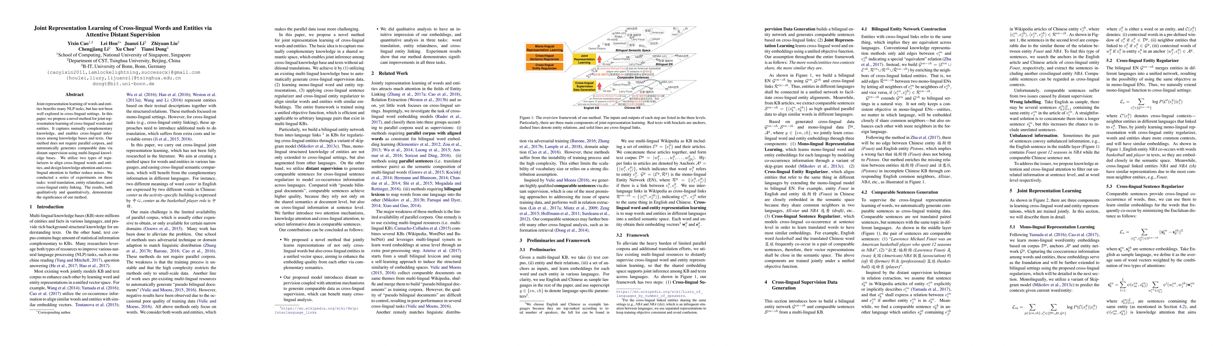 This paper proposes a method for joint representation learning of cross-lingual words and entities using attentive distant supervision, which aligns words and entities without parallel corpora by generating comparable data automatically. Experiments on word translation, entity relatedness, and cross-lingual entity linking show significant improvements.