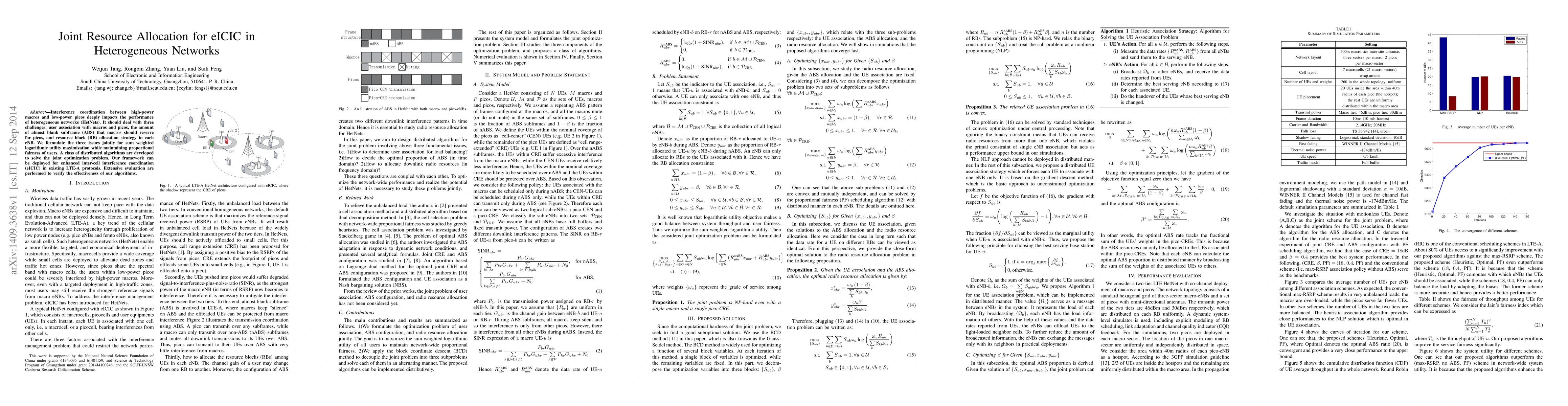 Interference coordination between high-power macros and low-power picos deeply impacts the performance of heterogeneous networks (HetNets). It should deal with three challenges: user association with macros and picos, the amount of almost blank subframe (ABS) that macros should reserve for picos, and resource block (RB) allocation strategy in each eNB. We formulate the three issues jointly for sum weighted logarithmic utility maximization while maintaining proportional fairness of users. A class of distributed algorithms are developed to solve the joint optimization problem. Our framework can be deployed for enhanced inter-cell interference coordination (eICIC) in existing LTE-A protocols. Extensive evaluation are performed to verify the effectiveness of our algorithms.