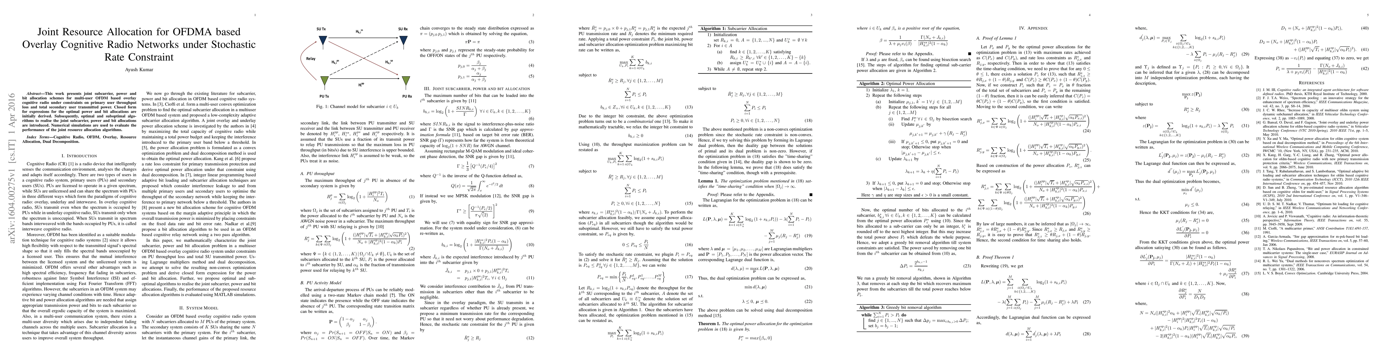 This paper proposes joint subcarrier, power, and bit allocation schemes for multi-user OFDM-based overlay cognitive radio networks, optimizing under stochastic rate constraints. It derives closed-form expressions for optimal allocations and introduces both optimal and suboptimal algorithms for implementation, evaluated via numerical simulations.