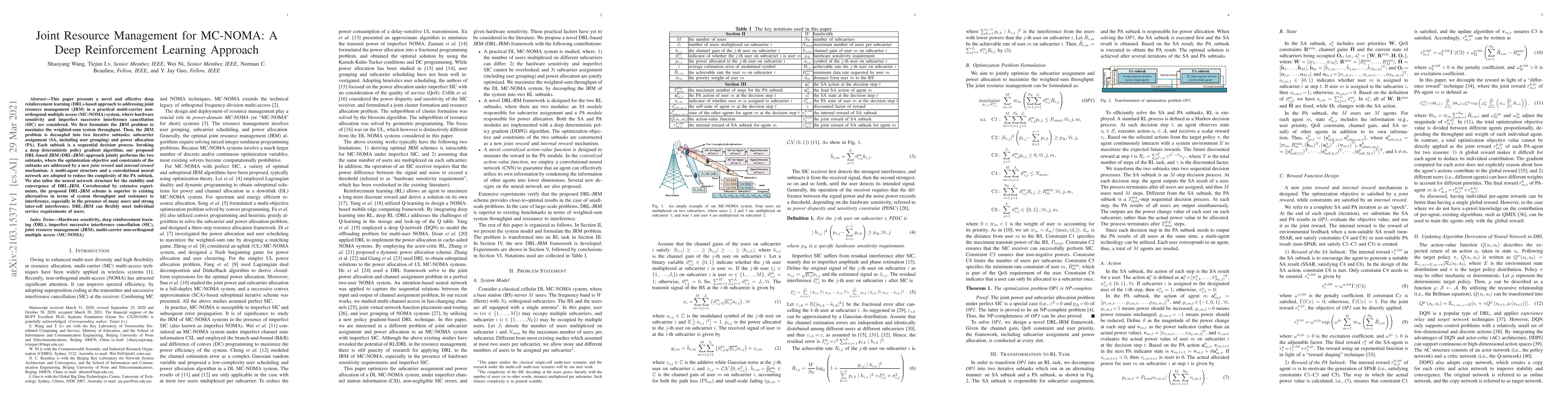 This paper proposes a deep reinforcement learning (DRL) approach for joint resource management in multi-carrier non-orthogonal multiple access (MC-NOMA) systems, optimizing subcarrier assignment and power allocation to maximize system throughput while considering hardware sensitivity and imperfect successive interference cancellation. The DRL-JRM method outperforms existing methods in terms of throughput and interference resistance.