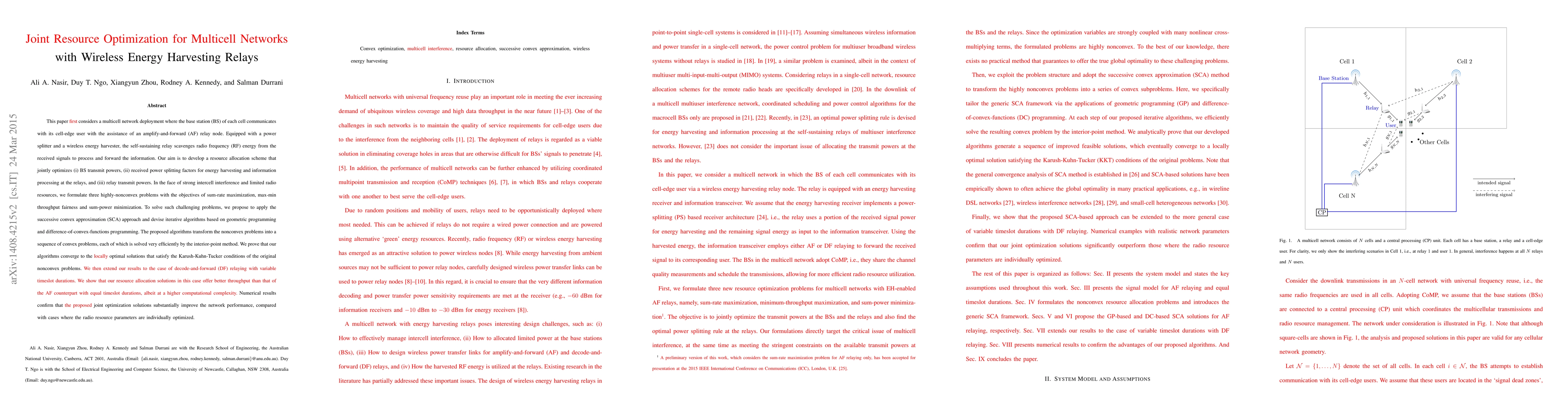 This paper proposes a joint optimization scheme to maximize sum-rate, ensure max-min throughput fairness, and minimize total power consumption in multicell networks with wireless energy harvesting relays. The proposed algorithm improves network performance by up to 50% compared to individual optimization approaches.