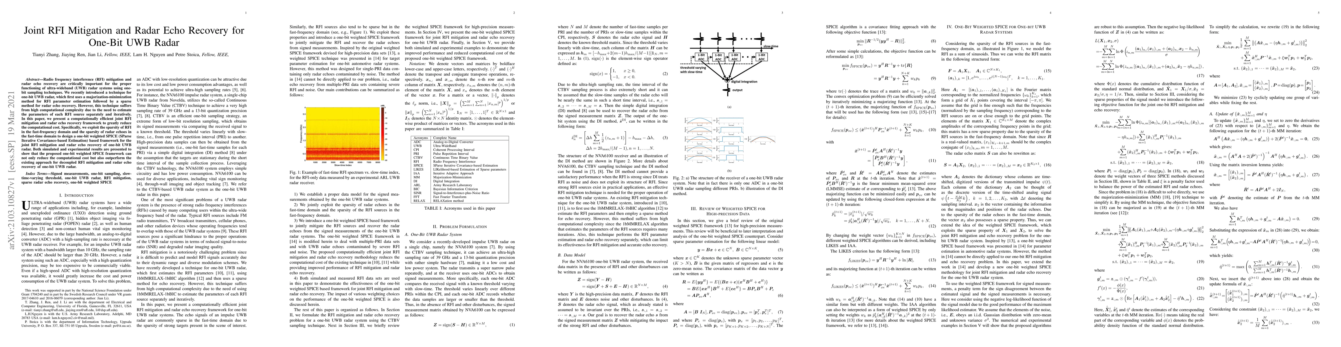 This paper proposes a computationally efficient joint RFI mitigation and radar echo recovery framework for one-bit UWB radar, leveraging sparsity in the fast-frequency and fast-time domains. The new one-bit weighted SPICE framework reduces computational costs and outperforms existing methods.