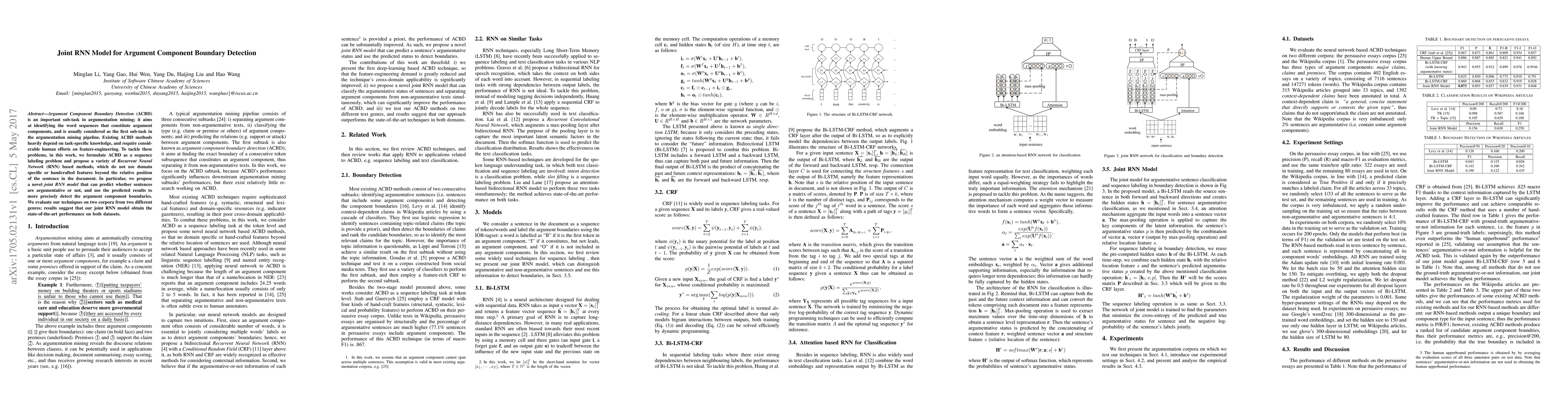 This paper proposes RNN-based methods for Argument Component Boundary Detection (ACBD), eliminating the need for task-specific features and manual feature engineering. The joint RNN model predicts sentence argumentativeness to enhance boundary detection, achieving state-of-the-art performance on two diverse corpora.