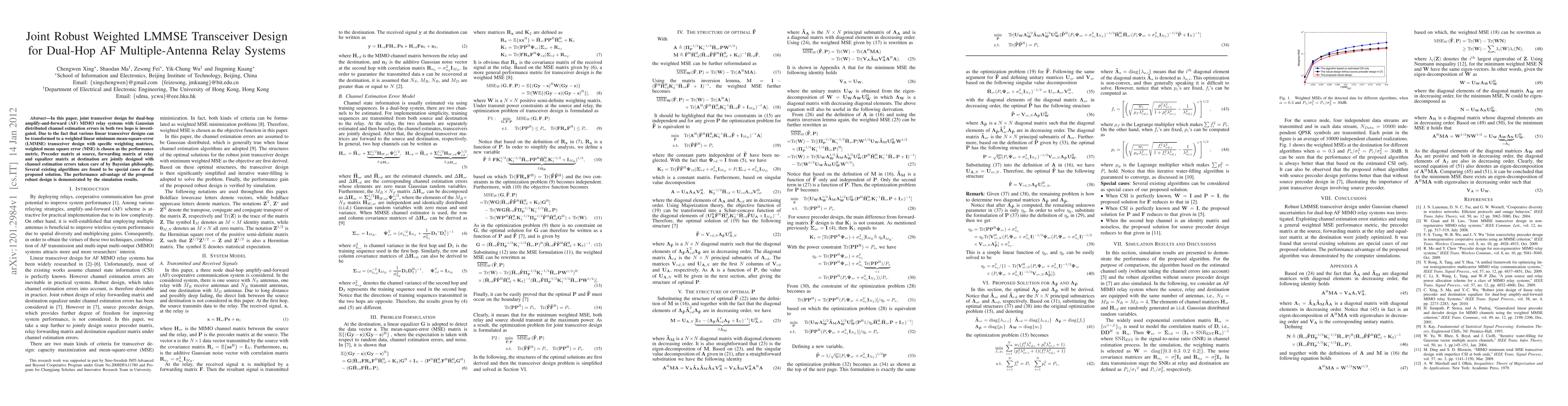 This paper proposes a joint robust weighted LMMSE transceiver design for dual-hop AF MIMO relay systems, optimizing the precoder, forwarding, and equalizer matrices to minimize weighted mean square error while accounting for channel estimation errors. Simulation results show the performance benefits of the proposed robust design.