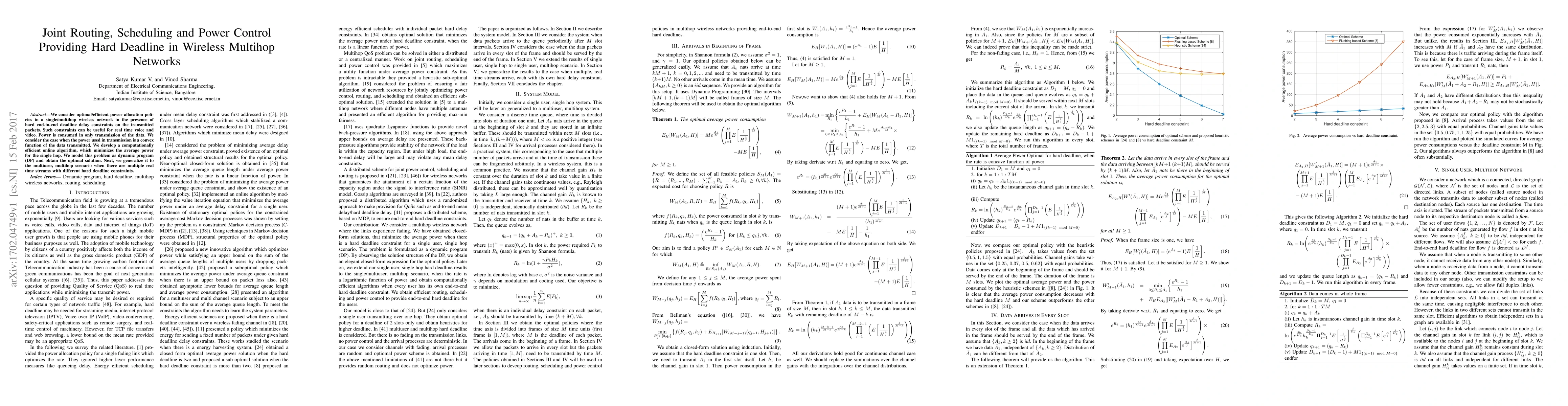 This paper develops an efficient online algorithm for optimal power allocation in single and multihop wireless networks under hard deadline constraints, modeling the problem as a dynamic program to minimize average power consumption. It extends the solution to multiuser, multihop scenarios with multiple real-time streams.