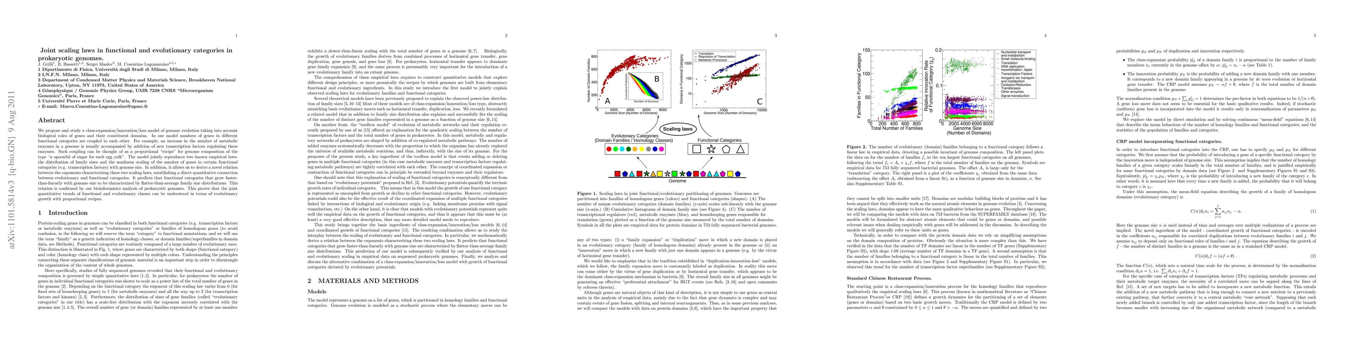 We propose and study a class-expansion/innovation/loss model of genome evolution taking into account biological roles of genes and their constituent domains. In our model numbers of genes in different functional categories are coupled to each other. For example, an increase in the number of metabolic enzymes in a genome is usually accompanied by addition of new transcription factors regulating these enzymes. Such coupling can be thought of as a proportional "recipe" for genome composition of the type "a spoonful of sugar for each egg yolk". The model jointly reproduces two known empirical laws: the distribution of family sizes and the nonlinear scaling of the number of genes in certain functional categories (e.g. transcription factors) with genome size. In addition, it allows us to derive a novel relation between the exponents characterising these two scaling laws, establishing a direct quantitative connection between evolutionary and functional categories. It predicts that functional categories that grow faster-than-linearly with genome size to be characterised by flatter-than-average family size distributions. This relation is confirmed by our bioinformatics analysis of prokaryotic genomes. This proves that the joint quantitative trends of functional and evolutionary classes can be understood in terms of evolutionary growth with proportional recipes.