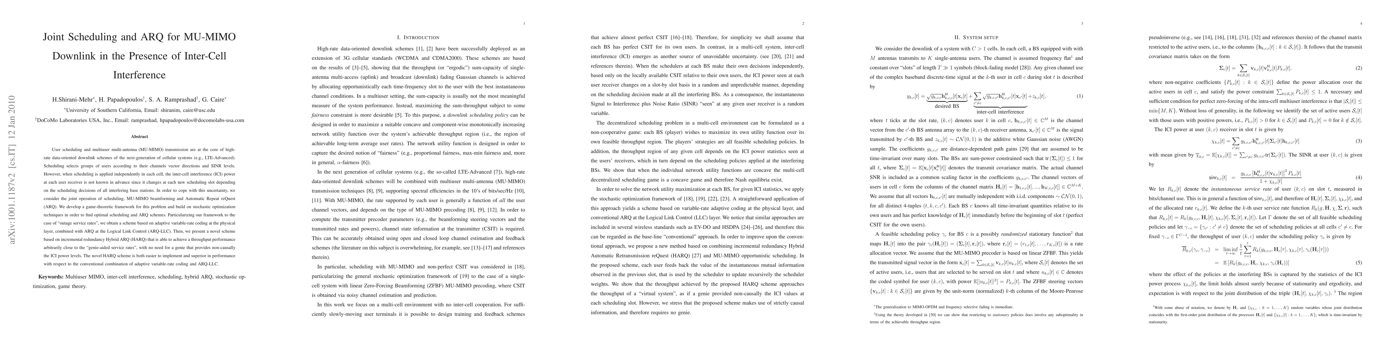 This paper proposes joint scheduling, MU-MIMO beamforming, and ARQ techniques to manage inter-cell interference in LTE-Advanced systems. It introduces a game-theoretic framework and stochastic optimization to develop optimal schemes, including adaptive variable-rate coding and incremental redundancy Hybrid ARQ, which outperform conventional methods.
