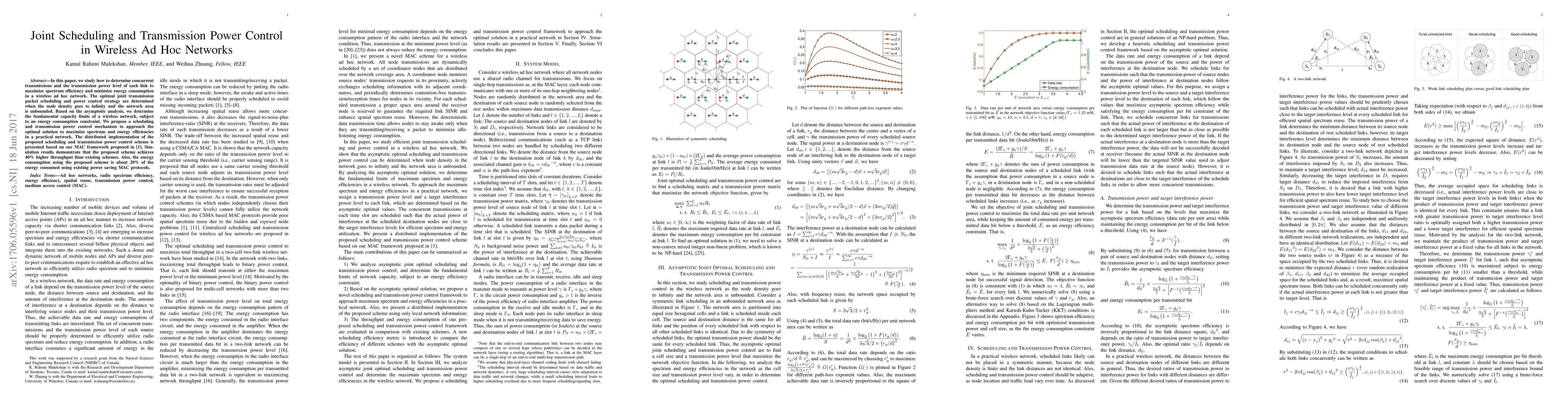 This paper proposes a joint scheduling and transmission power control strategy to maximize spectrum efficiency and minimize energy consumption in wireless ad hoc networks. The study determines optimal solutions through asymptotic analysis and demonstrates a 40% higher throughput and 80% lower energy consumption compared to existing methods.