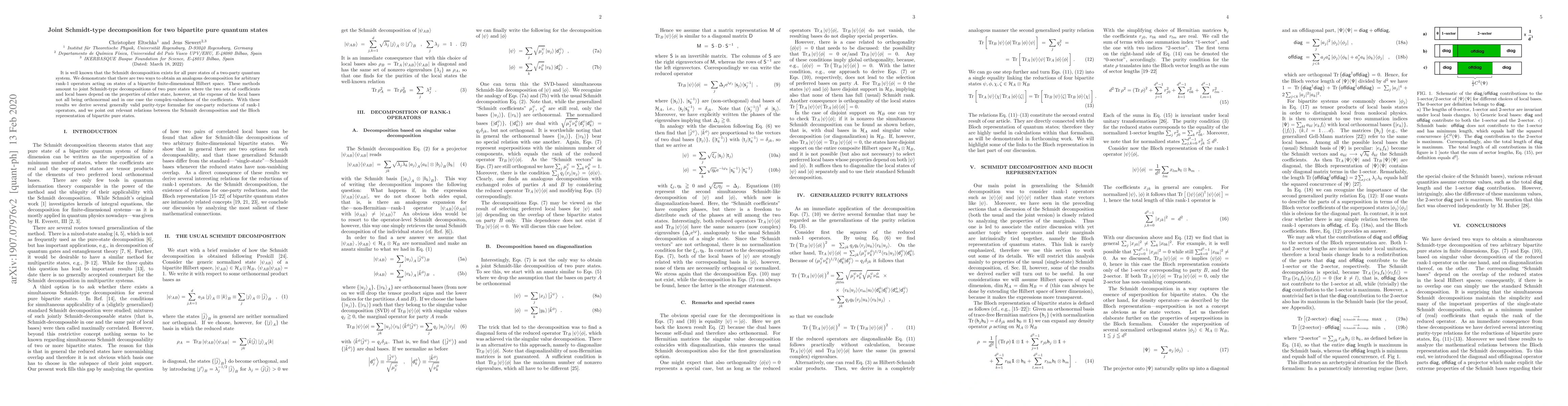 This paper presents two joint Schmidt-type decompositions for rank-1 operators on bipartite pure quantum states, highlighting their properties and deriving purity-type formulae. It also discusses the relationship between these decompositions and the Bloch representation of bipartite states.