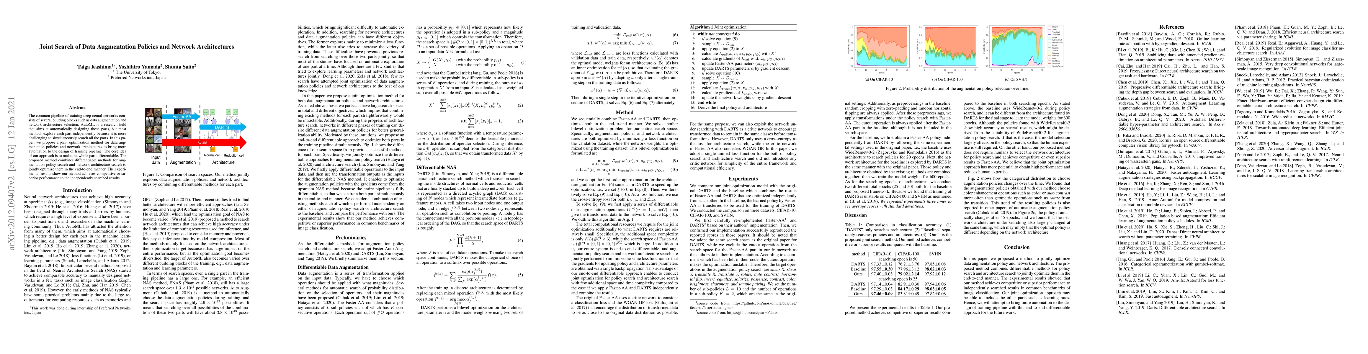 This paper proposes a joint optimization method for data augmentation policies and network architectures, aiming to automate the design of deep neural network training pipelines. The method makes the entire process differentiable, enabling end-to-end optimization and achieving competitive or superior performance compared to independent searches.