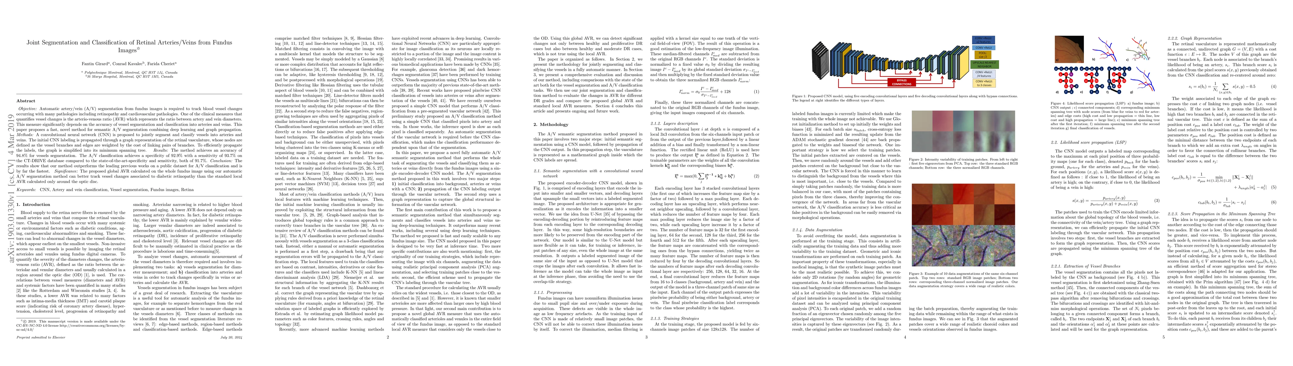 This paper proposes a novel deep learning method combining CNN and graph propagation for joint segmentation and classification of retinal arteries and veins from fundus images, achieving 94.8% segmentation accuracy and 92.9% specificity/93.7% sensitivity for A/V classification, outperforming previous methods and enabling more accurate tracking of vessel changes in diabetic retinopathy.