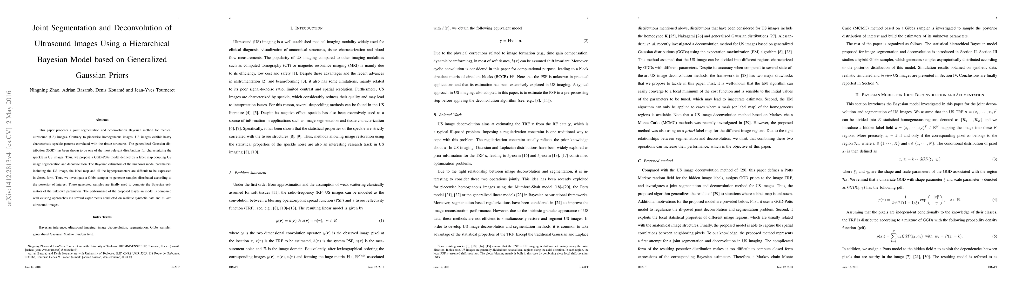 This paper proposes a joint segmentation and deconvolution Bayesian method for medical ultrasound (US) images. Contrary to piecewise homogeneous images, US images exhibit heavy characteristic speckle patterns correlated with the tissue structures. The generalized Gaussian distribution (GGD) has been shown to be one of the most relevant distributions for characterizing the speckle in US images. Thus, we propose a GGD-Potts model defined by a label map coupling US image segmentation and deconvolution. The Bayesian estimators of the unknown model parameters, including the US image, the label map and all the hyperparameters are difficult to be expressed in closed form. Thus, we investigate a Gibbs sampler to generate samples distributed according to the posterior of interest. These generated samples are finally used to compute the Bayesian estimators of the unknown parameters. The performance of the proposed Bayesian model is compared with existing approaches via several experiments conducted on realistic synthetic data and in vivo US images.