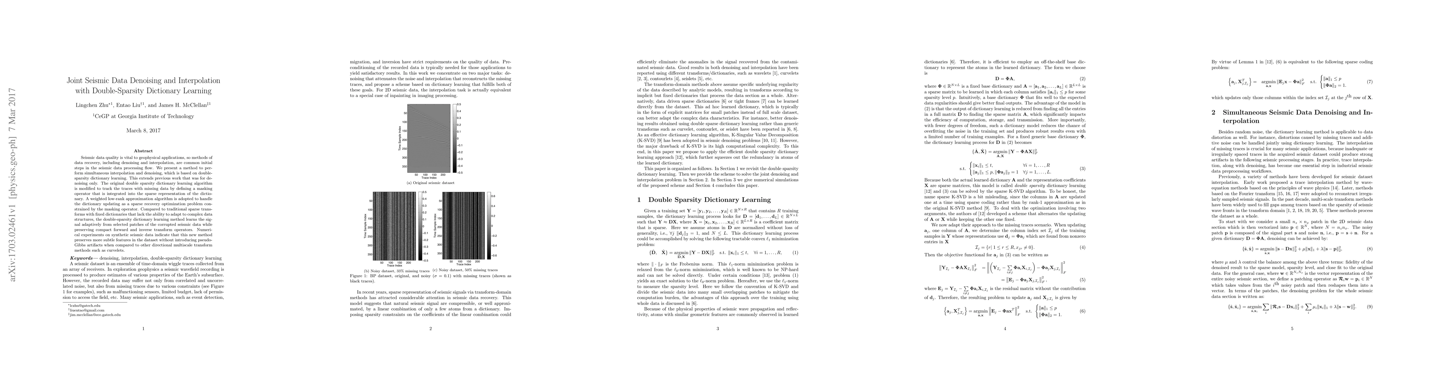 This paper proposes a method for simultaneous denoising and interpolation of seismic data using double-sparsity dictionary learning. The approach modifies the original algorithm to handle missing data through a masking operator, enabling adaptive signal learning from corrupted data patches.