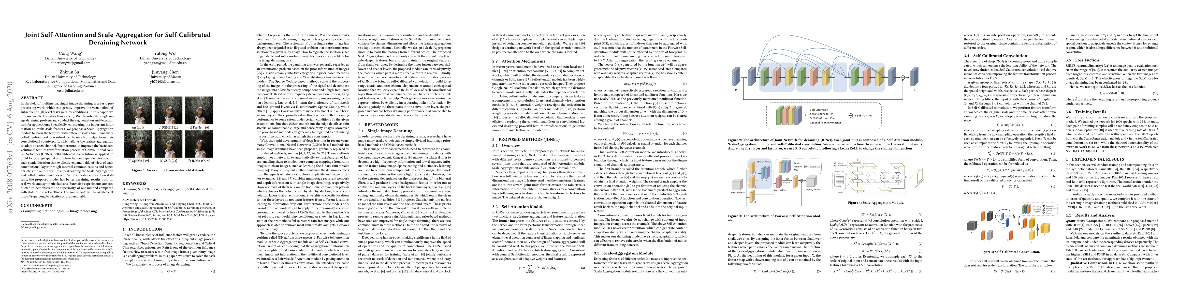 In the field of multimedia, single image deraining is a basic pre-processing work, which can greatly improve the visual effect of subsequent high-level tasks in rainy conditions. In this paper, we propose an effective algorithm, called JDNet, to solve the single image deraining problem and conduct the segmentation and detection task for applications. Specifically, considering the important information on multi-scale features, we propose a Scale-Aggregation module to learn the features with different scales. Simultaneously, Self-Attention module is introduced to match or outperform their convolutional counterparts, which allows the feature aggregation to adapt to each channel. Furthermore, to improve the basic convolutional feature transformation process of Convolutional Neural Networks (CNNs), Self-Calibrated convolution is applied to build long-range spatial and inter-channel dependencies around each spatial location that explicitly expand fields-of-view of each convolutional layer through internal communications and hence enriches the output features. By designing the Scale-Aggregation and Self-Attention modules with Self-Calibrated convolution skillfully, the proposed model has better deraining results both on real-world and synthetic datasets. Extensive experiments are conducted to demonstrate the superiority of our method compared with state-of-the-art methods. The source code will be available at \url{https://supercong94.wixsite.com/supercong94}.