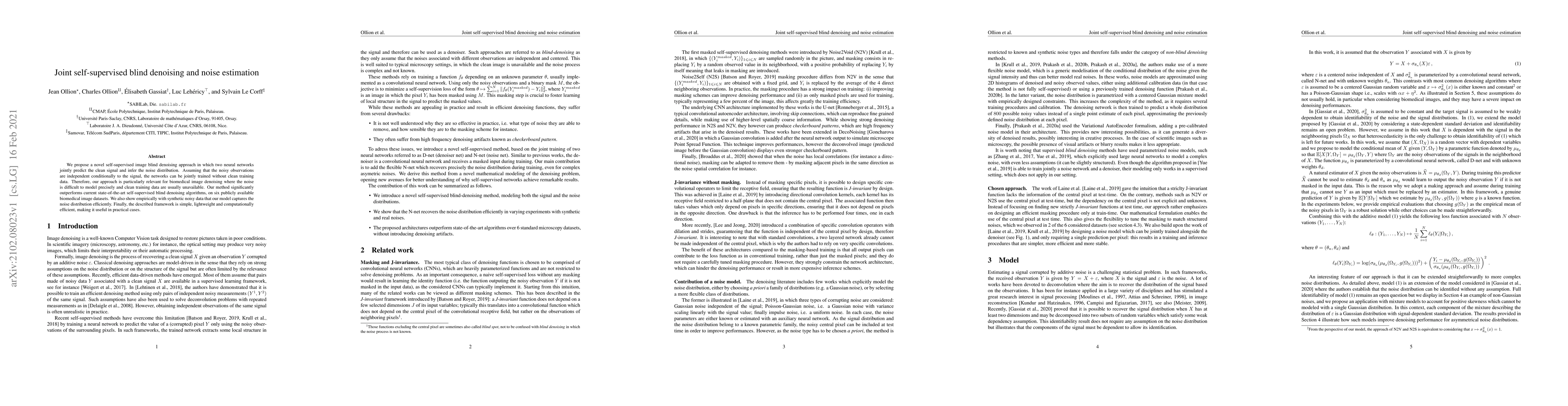 This paper introduces a self-supervised neural network framework that jointly predicts clean images and estimates noise distributions from noisy observations without requiring clean training data. The approach outperforms existing methods on biomedical image datasets, demonstrating efficiency in capturing noise distributions and offering a simple, lightweight solution.