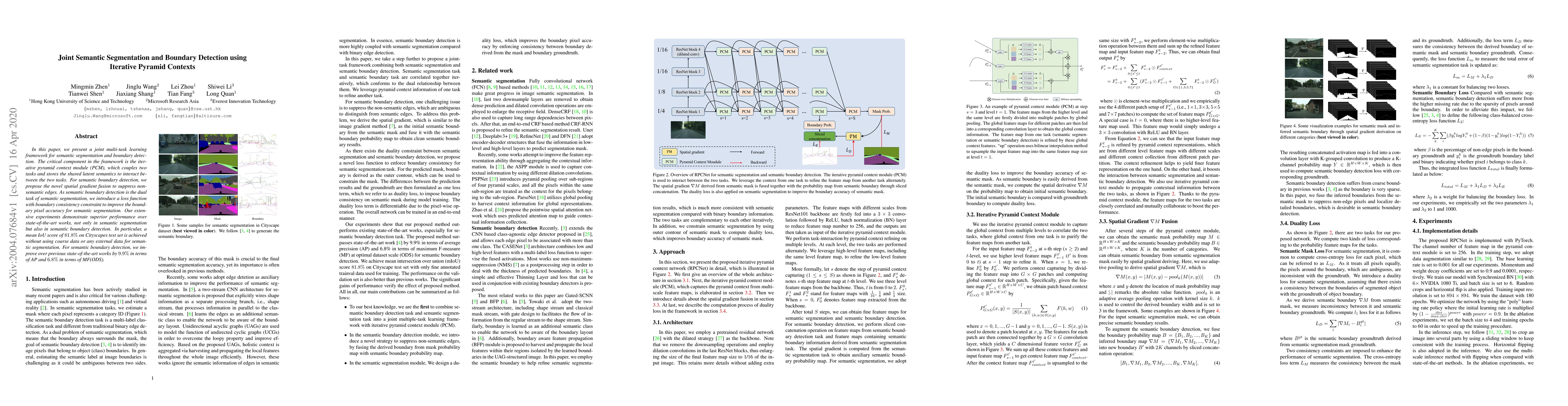 This paper introduces a joint multi-task learning framework for semantic segmentation and boundary detection using an iterative pyramid context module. It employs spatial gradient fusion and a boundary consistency loss function, achieving superior performance with a 81.8% mean IoU on Cityscapes and a 9.9% improvement in AP for boundary detection.
