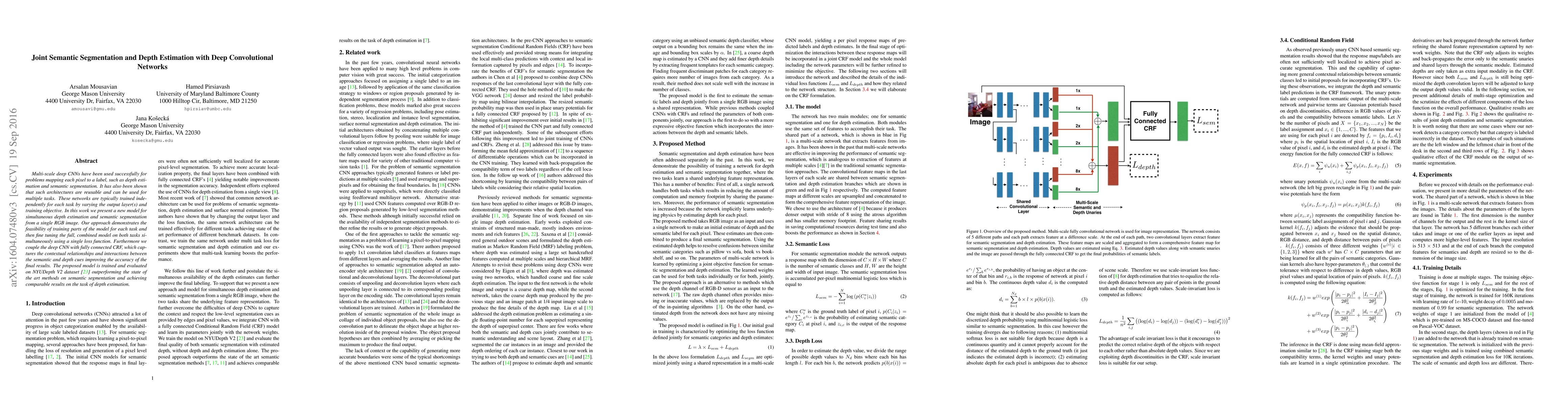 This research introduces a novel deep convolutional neural network (CNN) model for jointly performing semantic segmentation and depth estimation from a single RGB image. The approach combines multi-scale deep CNNs with fully connected CRF to enhance accuracy by capturing contextual relationships, achieving state-of-the-art results in semantic segmentation and competitive depth estimation on the NYUDepth V2 dataset.