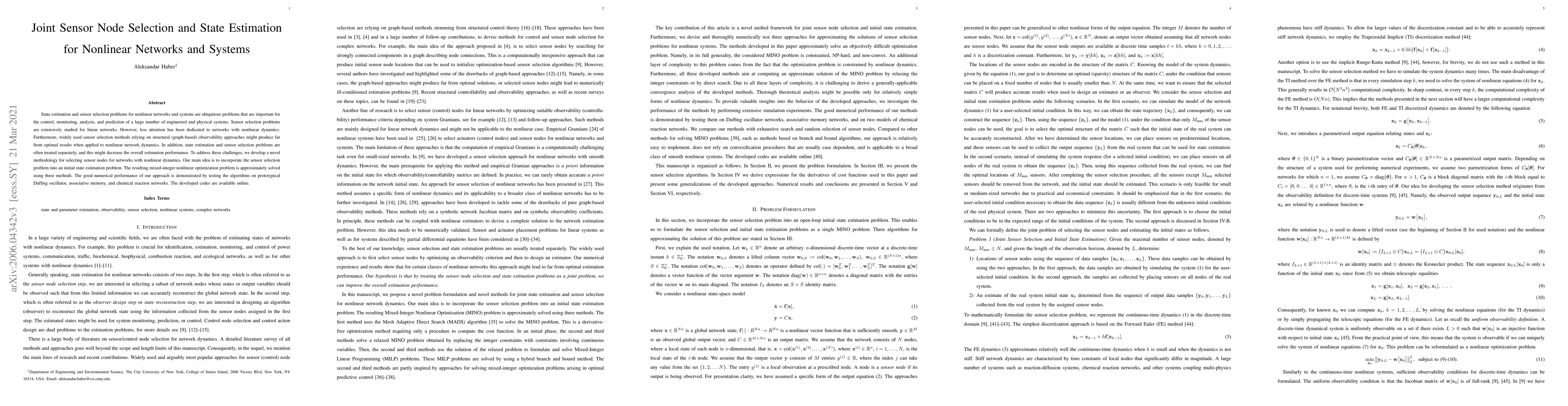 This paper presents a novel methodology for jointly selecting sensor nodes and estimating states in nonlinear networks and systems, addressing the gap in existing methods for nonlinear dynamics. The proposed approach integrates sensor selection into the state estimation process, enhancing overall estimation performance, and demonstrates effectiveness on Duffing oscillators, associative memory, and chemical reaction networks.