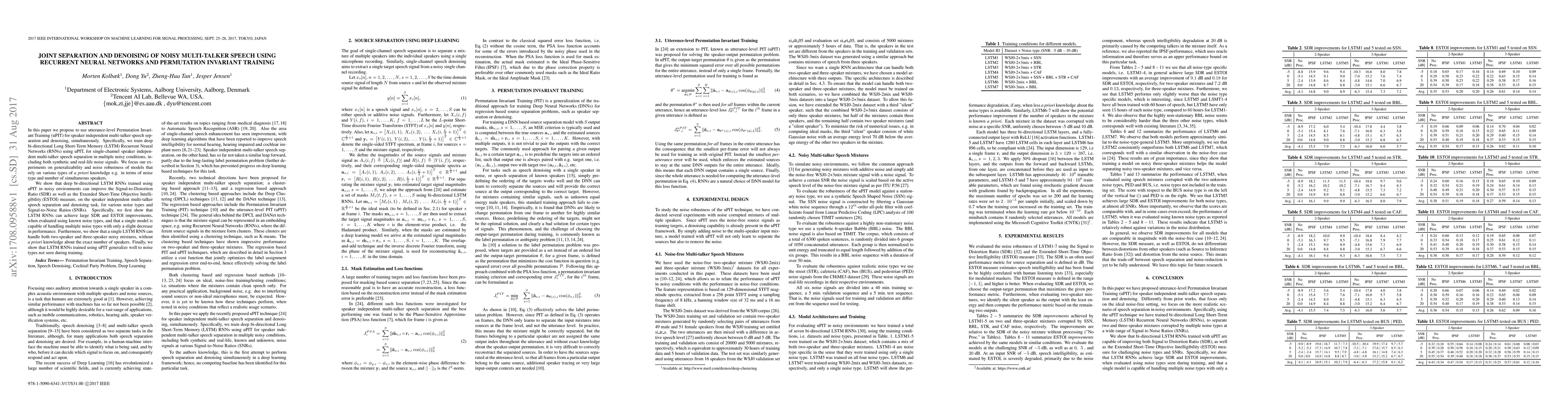 This paper proposes using Permutation Invariant Training (uPIT) with deep bi-directional LSTM RNNs for speaker-independent multi-talker speech separation and denoising. The trained models show improved Signal-to-Distortion Ratio (SDR) and Extended Short-Time Objective Intelligibility (ESTOI) across various noise types and Signal-to-Noise Ratios (SNRs), demonstrating robustness and generalizability.