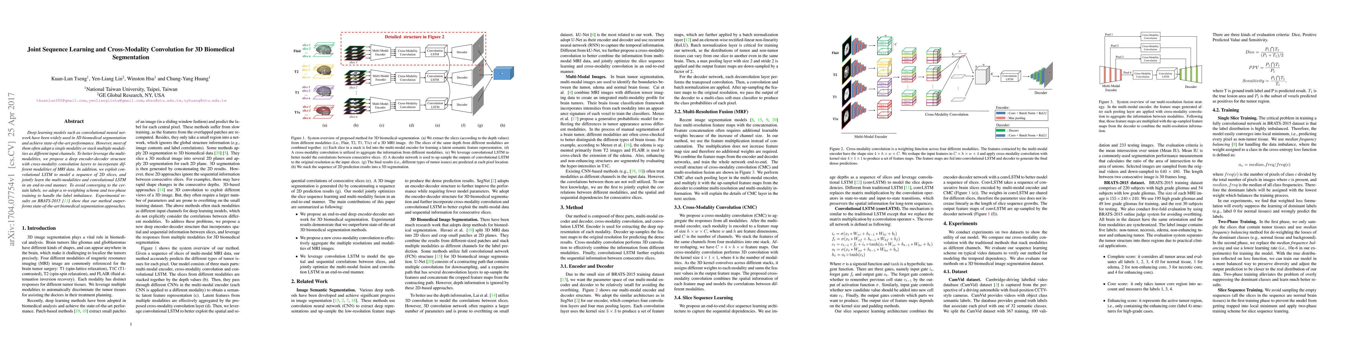 Deep learning models such as convolutional neural net- work have been widely used in 3D biomedical segmentation and achieve state-of-the-art performance. However, most of them often adapt a single modality or stack multiple modalities as different input channels. To better leverage the multi- modalities, we propose a deep encoder-decoder structure with cross-modality convolution layers to incorporate different modalities of MRI data. In addition, we exploit convolutional LSTM to model a sequence of 2D slices, and jointly learn the multi-modalities and convolutional LSTM in an end-to-end manner. To avoid converging to the certain labels, we adopt a re-weighting scheme and two-phase training to handle the label imbalance. Experimental results on BRATS-2015 show that our method outperforms state-of-the-art biomedical segmentation approaches.