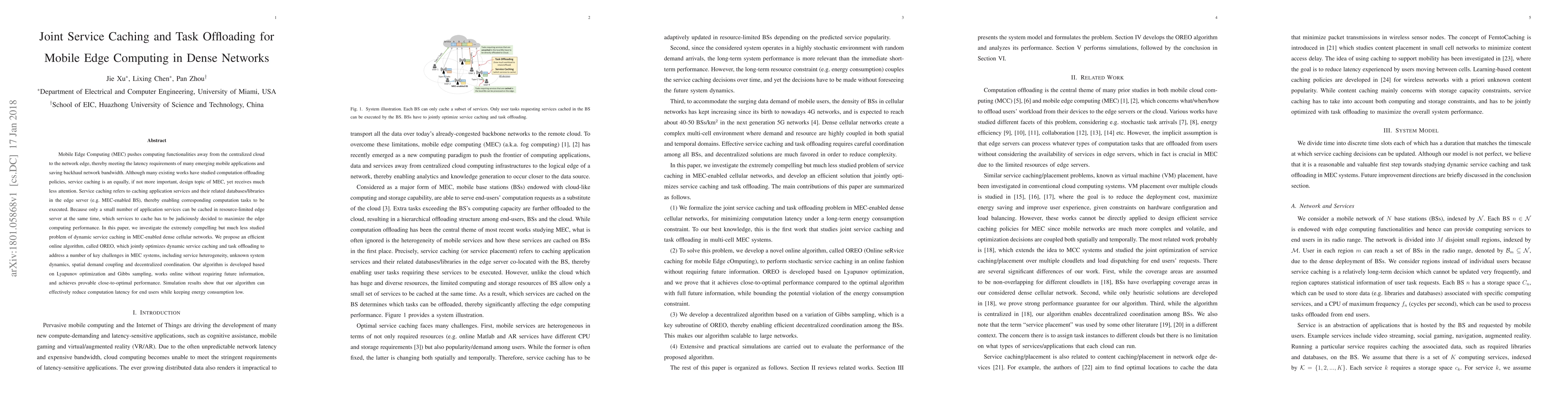 This paper proposes an online algorithm, OREO, to optimize dynamic service caching and task offloading in dense Mobile Edge Computing networks. The algorithm addresses challenges like service heterogeneity and decentralized coordination, achieving near-optimal performance and reducing computation latency while minimizing energy use.