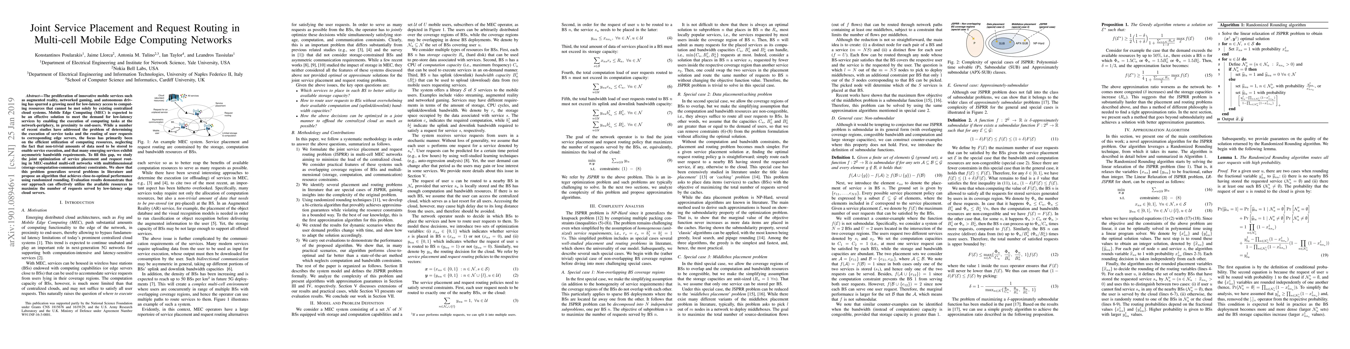 This paper addresses the joint optimization of service placement and request routing in multi-cell Mobile Edge Computing networks, considering multidimensional constraints. It proposes an algorithm using randomized rounding to achieve near-optimal performance, demonstrating effective resource utilization to maximize served requests.
