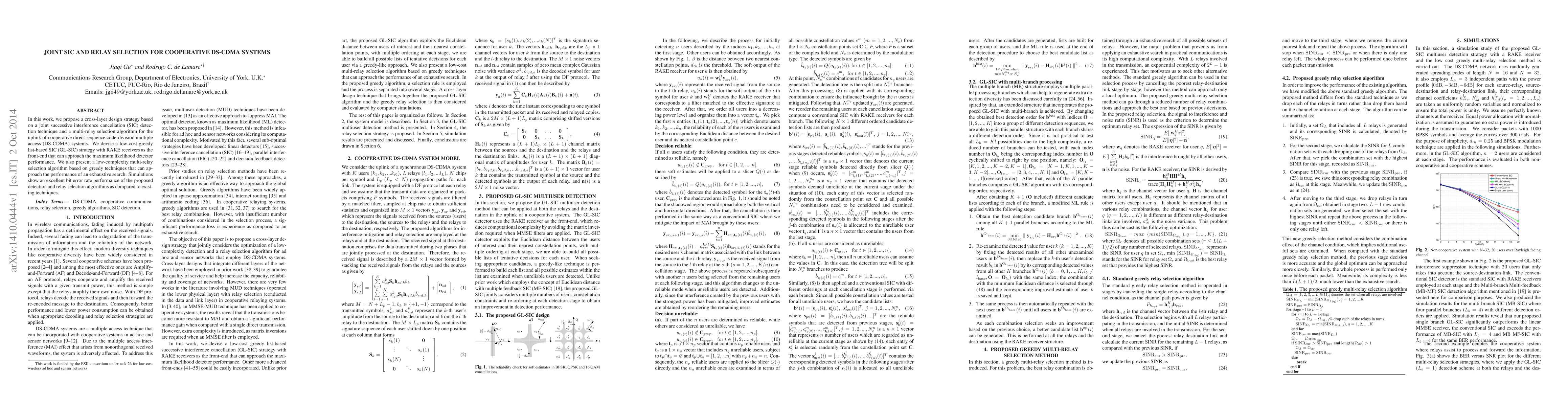 This paper proposes a cross-layer design combining a joint successive interference cancellation (SIC) detection technique and a multi-relay selection algorithm for cooperative DS-CDMA systems. The low-cost GL-SIC strategy leverages Euclidean distance and constellation points for effective detection, while the low-complexity greedy relay selection algorithm approaches exhaustive search performance, achieving superior bit error rate results in simulations.