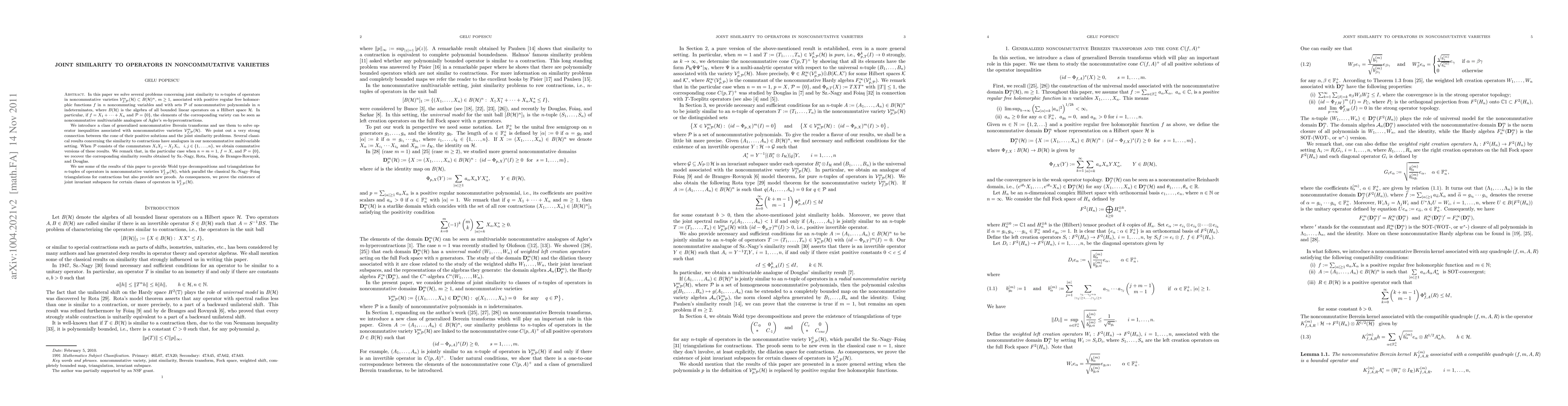 In this paper we solve several problems concerning joint similarity to n-tuples of operators in noncommutative varieties in $[B(\cH)^n]_1$ associated with positive regular free holomorphic functions in $n$ noncommuting variables and with sets of noncommutative polynomials in $n$ indeterminates, where $B(\cH)$ is the algebra of all bounded linear operators on a Hilbert space $\cH$. In particular, if $f=X_1+...+X_n$ and $\cP=\{0\}$, the elements of the corresponding variety can be seen as noncommutative multivariable analogues of Agler's $m$-hypercontractions.