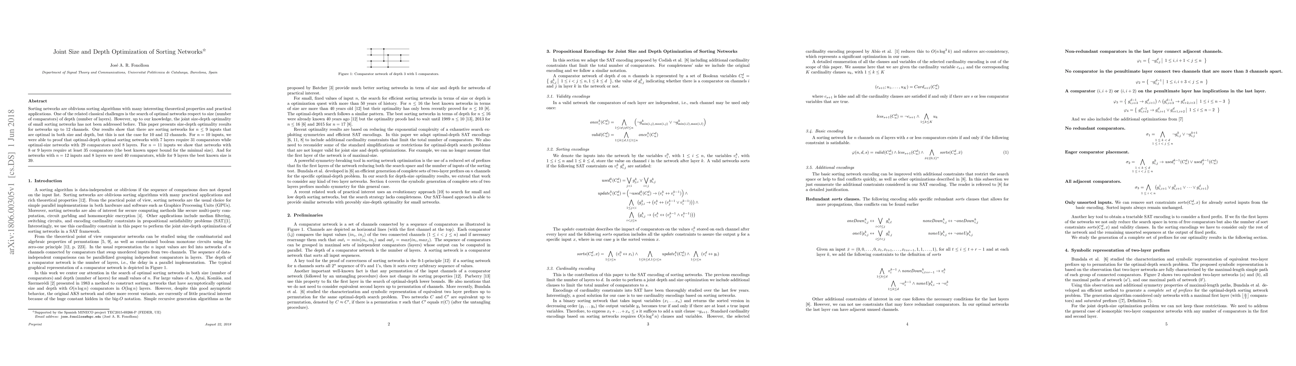 This paper investigates the joint size-depth optimization of sorting networks for up to 12 channels, revealing that networks for 9 inputs are optimal in both size and depth, while for 10 and 12 inputs, optimal size and depth networks differ. For $n=10$, optimal-depth networks require 31 comparators and 7 layers, while optimal-size networks need 29 comparators and 8 layers.